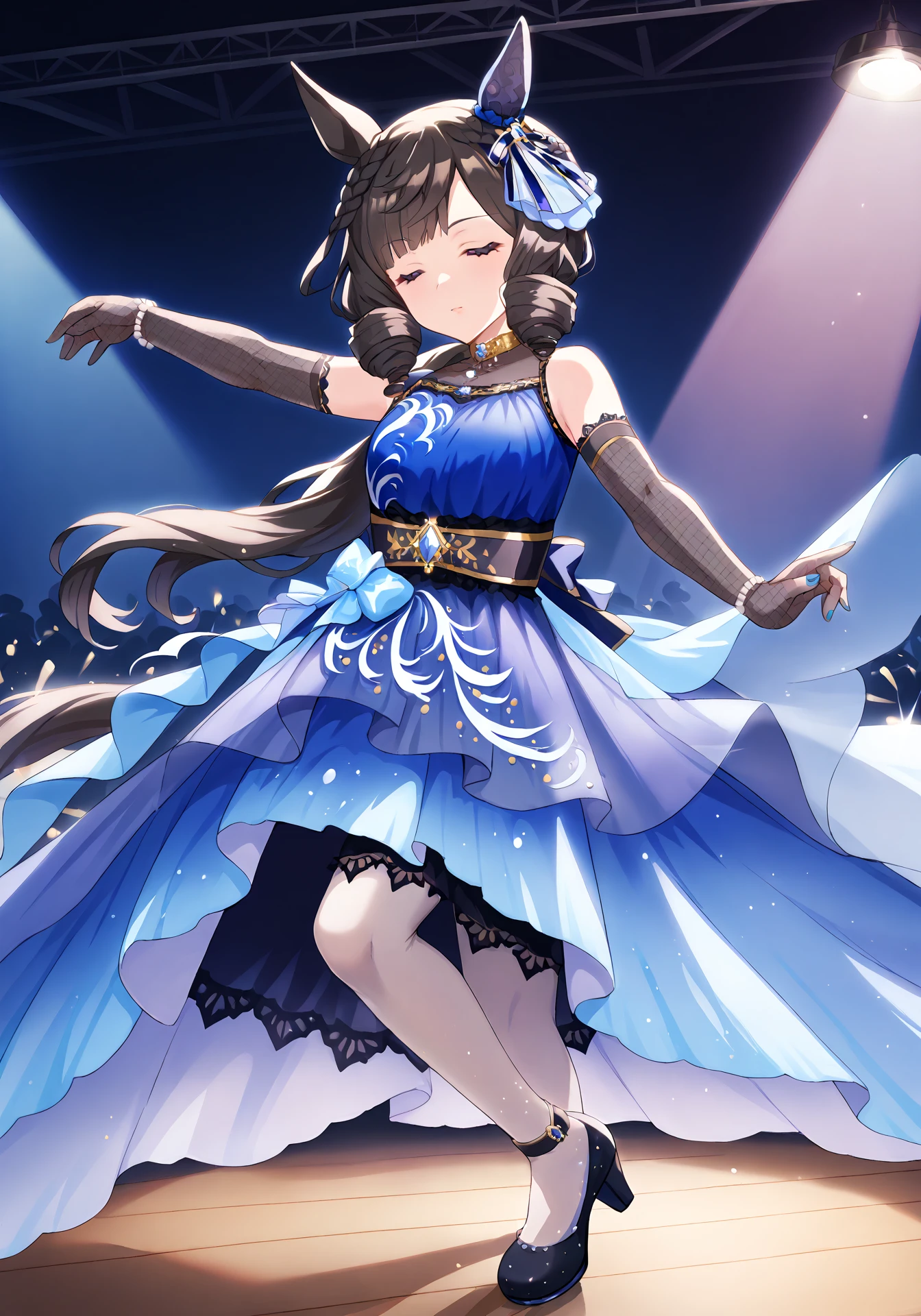 DRflowingBlue,blue sleeveless dress,black elbow fishnet gloves,light blue ribbon,one ear cover,black waistband,black underskirt,bare shoulders,black high heels,blue hair ornament,bracelet,low ponytail,jewelry,grey pantyhose
