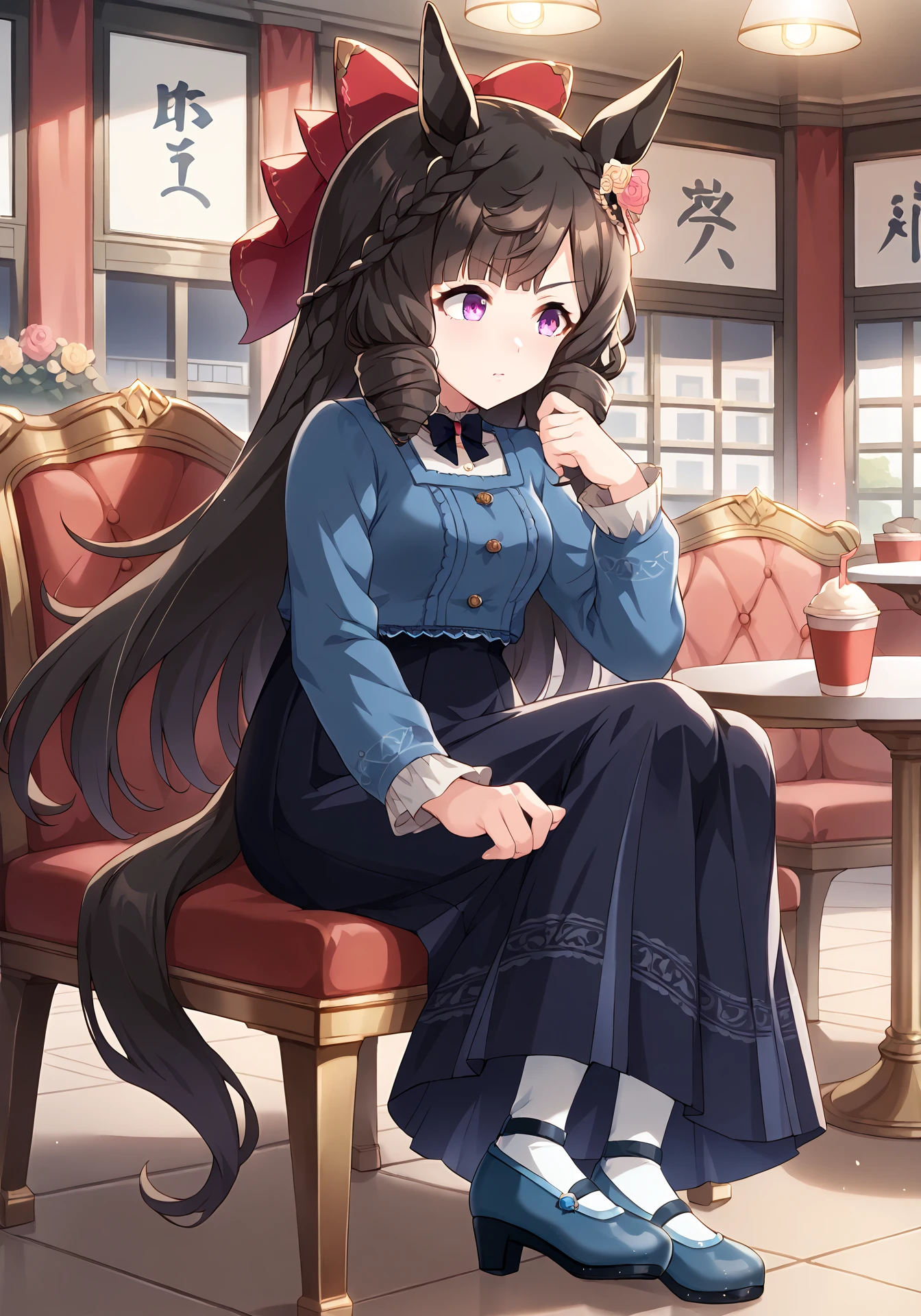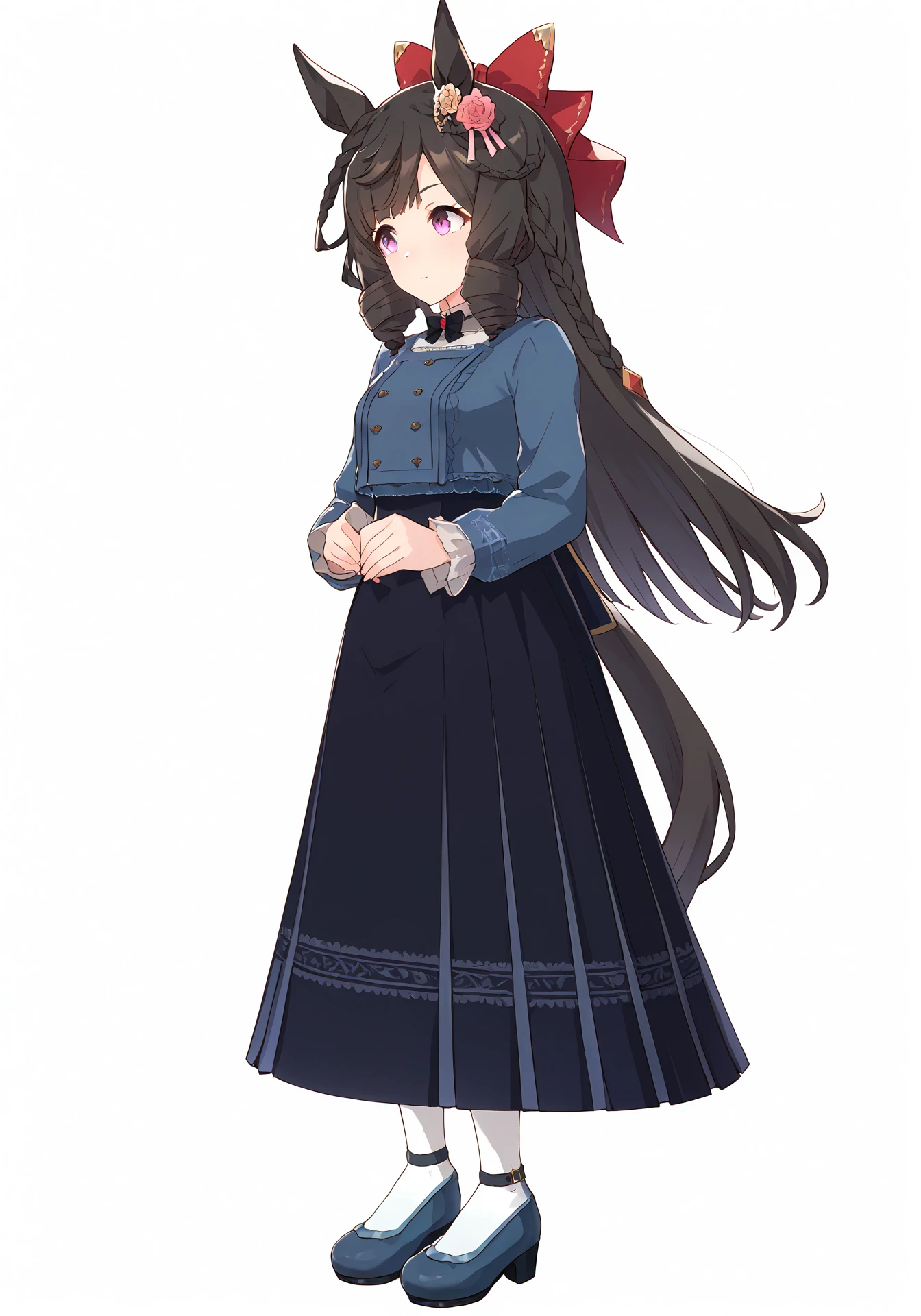 DRCasual,blue shirt,black long skirt,white pantyhose,blue high heels,red hair bow,black bow tie,hair flower