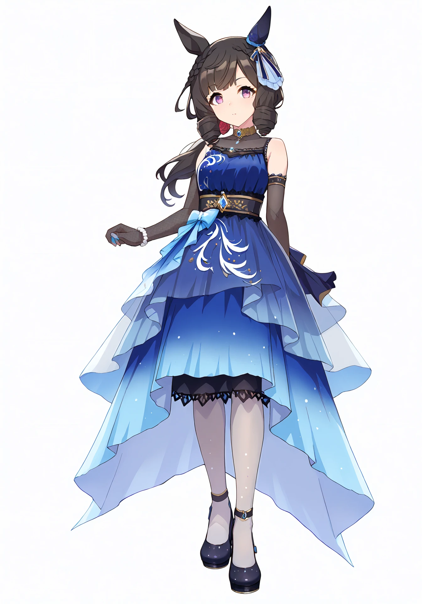 DRBlue,blue layered dress,elbow fishnet gloves,aqua waist bow,single ear cover,black waistband,black high heels,blue hair ornament,bracelet,low ponytail,necklace,grey pantyhose,black petticoat,hair scrunchie,blue nails