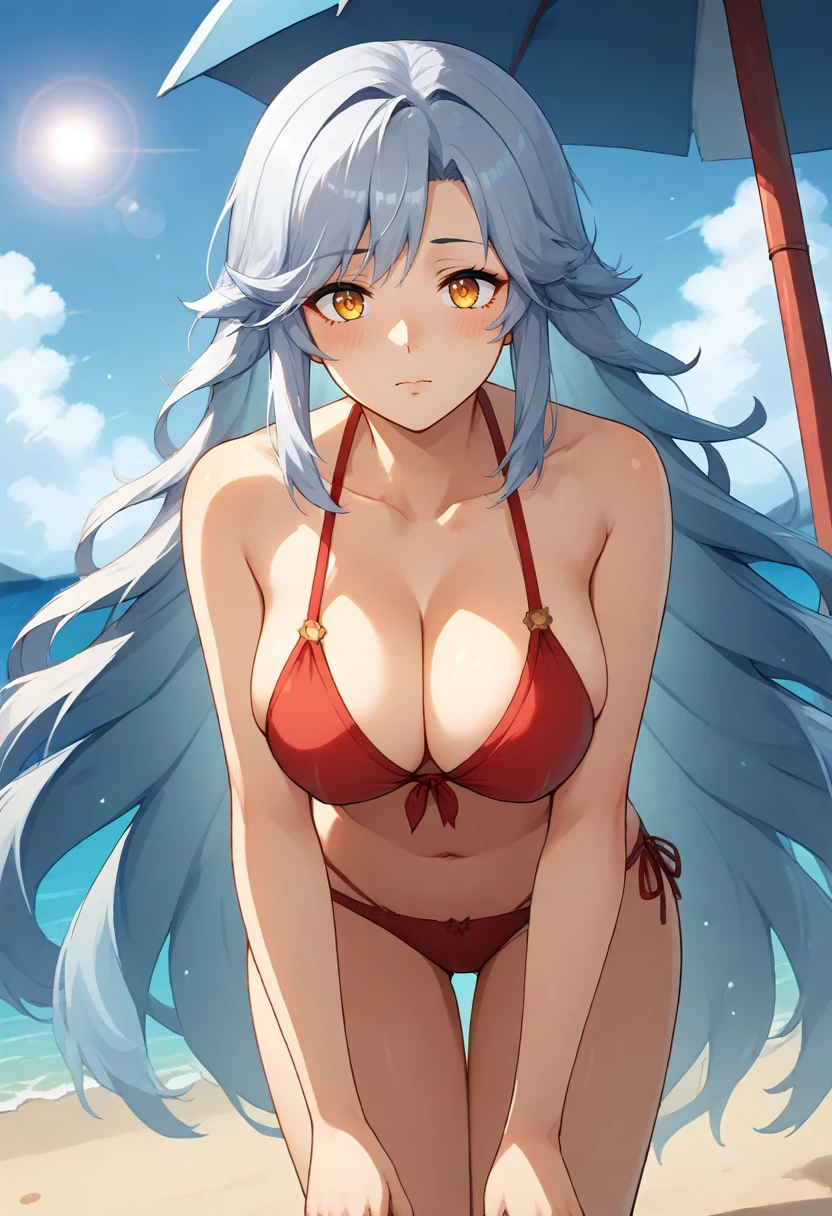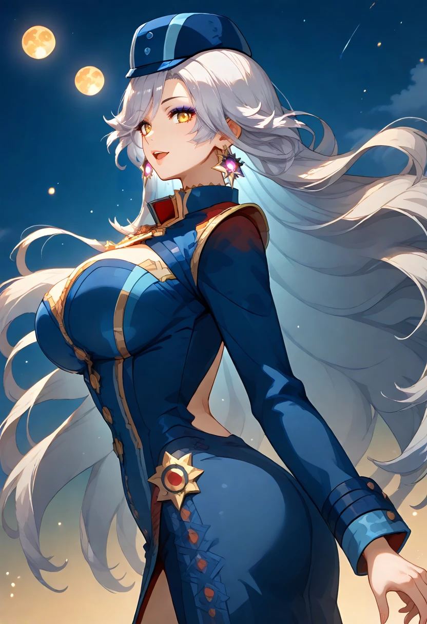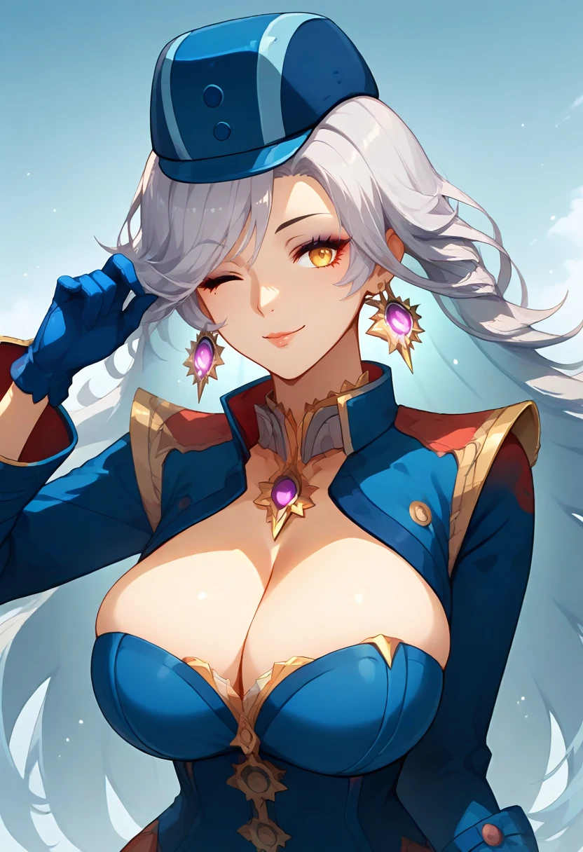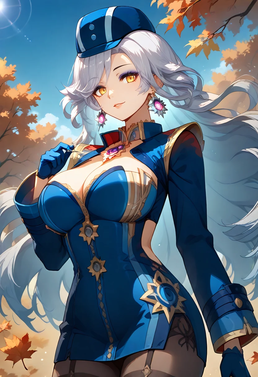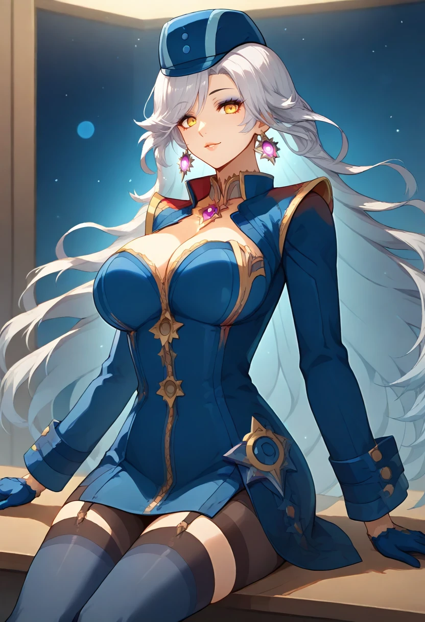 liora_personaoc, very long hair, whiet hair, yellow eyes, make up, liora_costume, blue headwear, blue dress, long sleeves, cleavage, cleavage cutout, earrings, pink brooch, jewelry, blue gloves, brown pantyhose / thighhighs, garter straps
