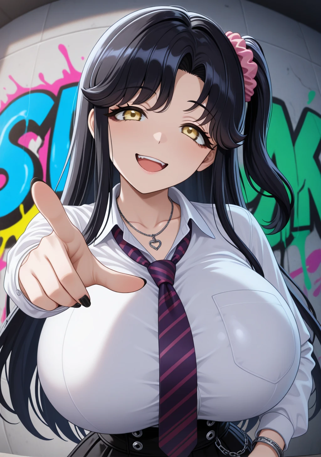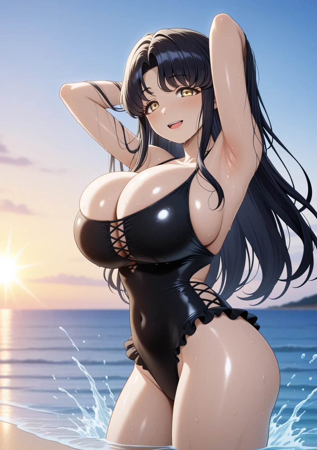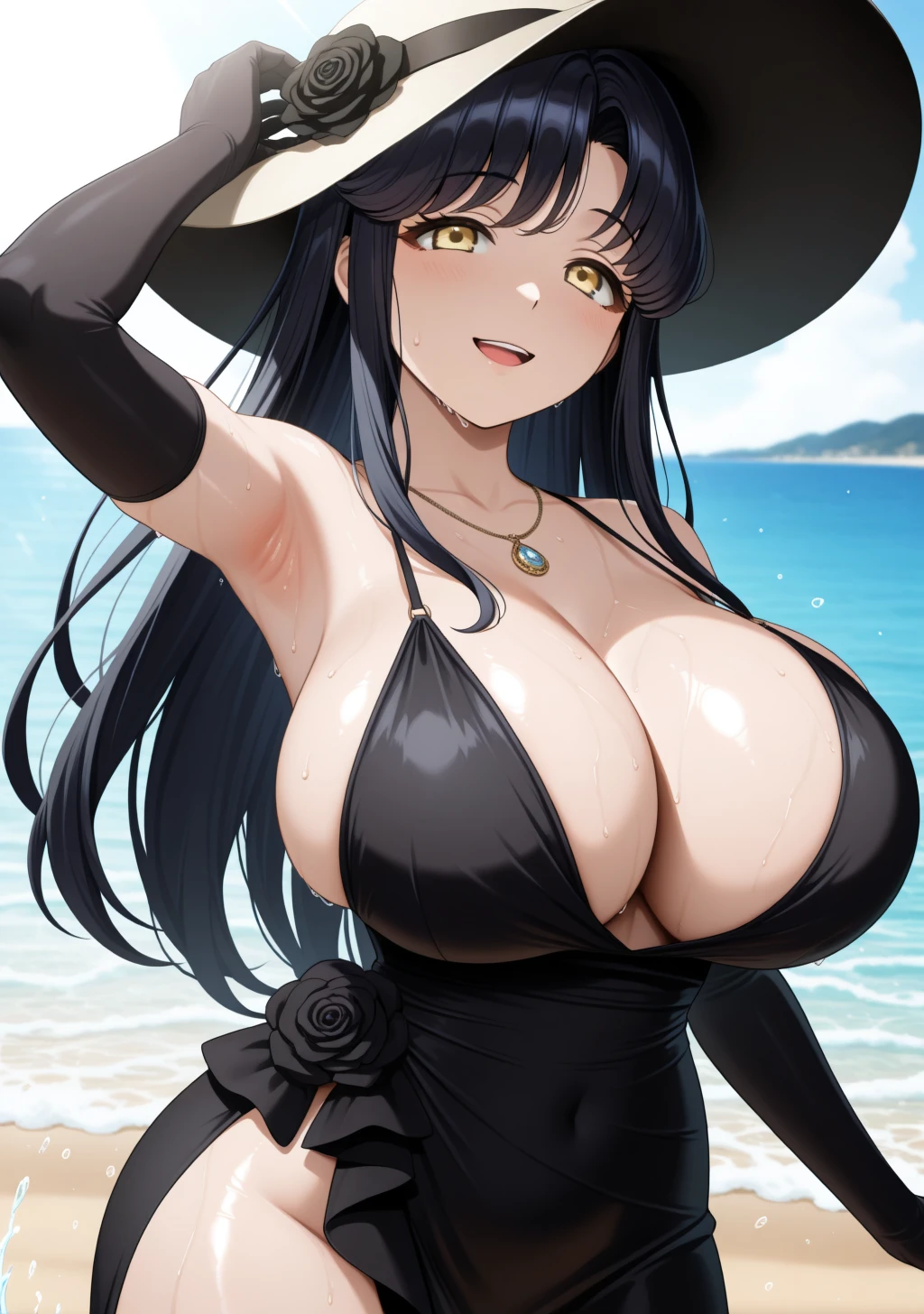 "huge breasts,long hair,black hair,yellow eyes,tareme"