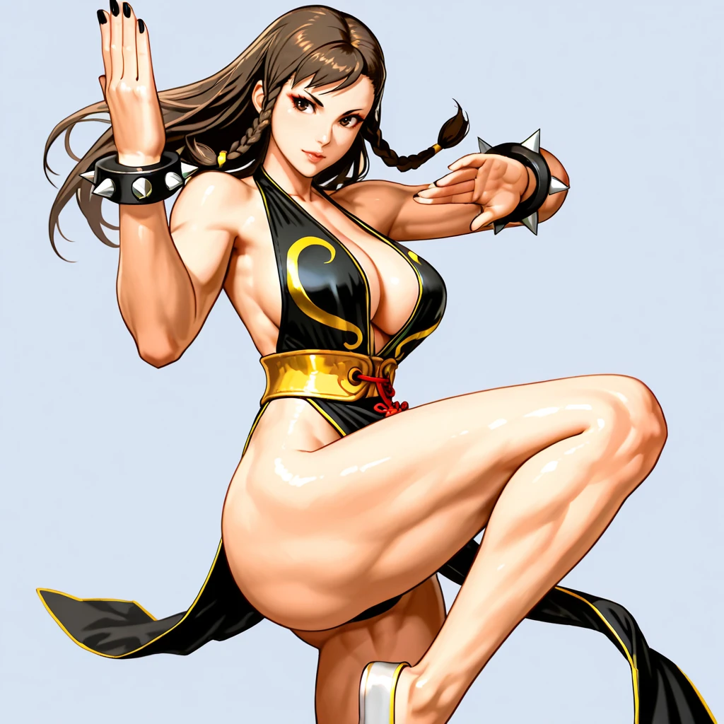 Trigger with black dress: ChunLiBlackDress, 1girl, chun-li, pelvic curtain, braid, black dress, large breasts, brown hair, spikes, spiked bracelet, twin braids, official alternate costume, no bra, long hair, jewelry, revealing clothes, brown eyes, lips, bare legs, chinese clothes, nail polish, flats, china dress, alternate hairstyle, black nails, muscular female, side braids, sash, thighs, cleavage, bare hips, toned, cowboy shot