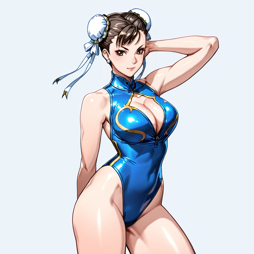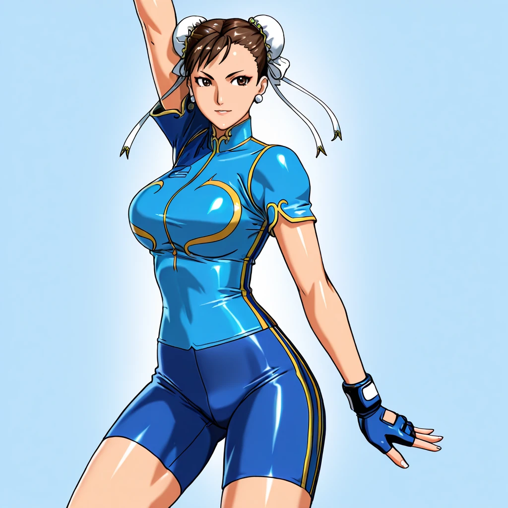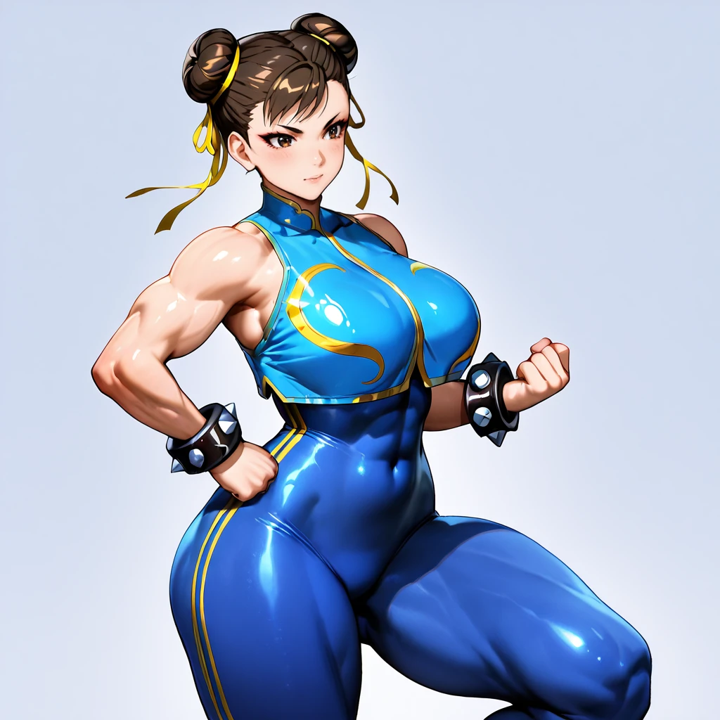 Trigger with alpha look: ChunLiAlpha, 1girl, chun-li, double bun, hair bun, brown hair, large breasts, brown eyes, jewelry, studded bracelet, thick thighs, muscular female, hair ribbon, blue bodysuit, sleeveless, unitard, skin tight, bare shoulders, spiked bracelet, spikes, covered navel, short hair