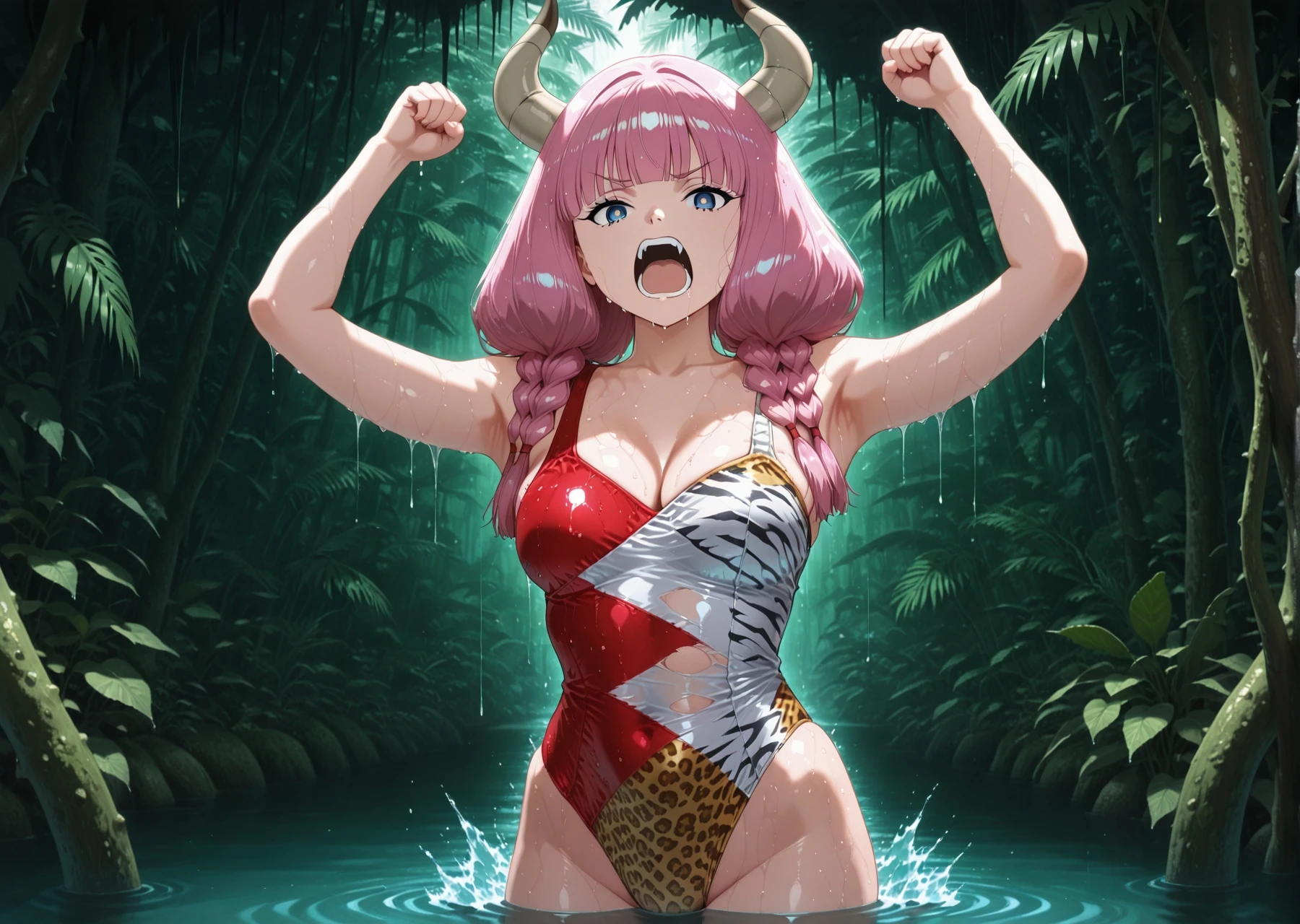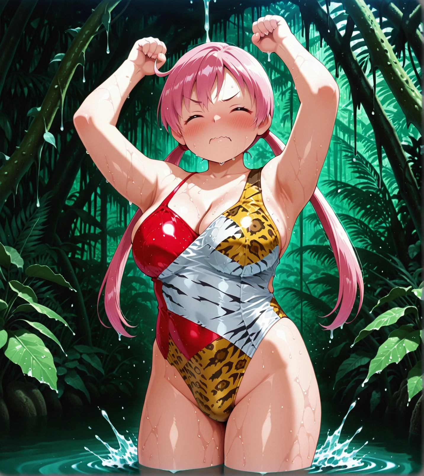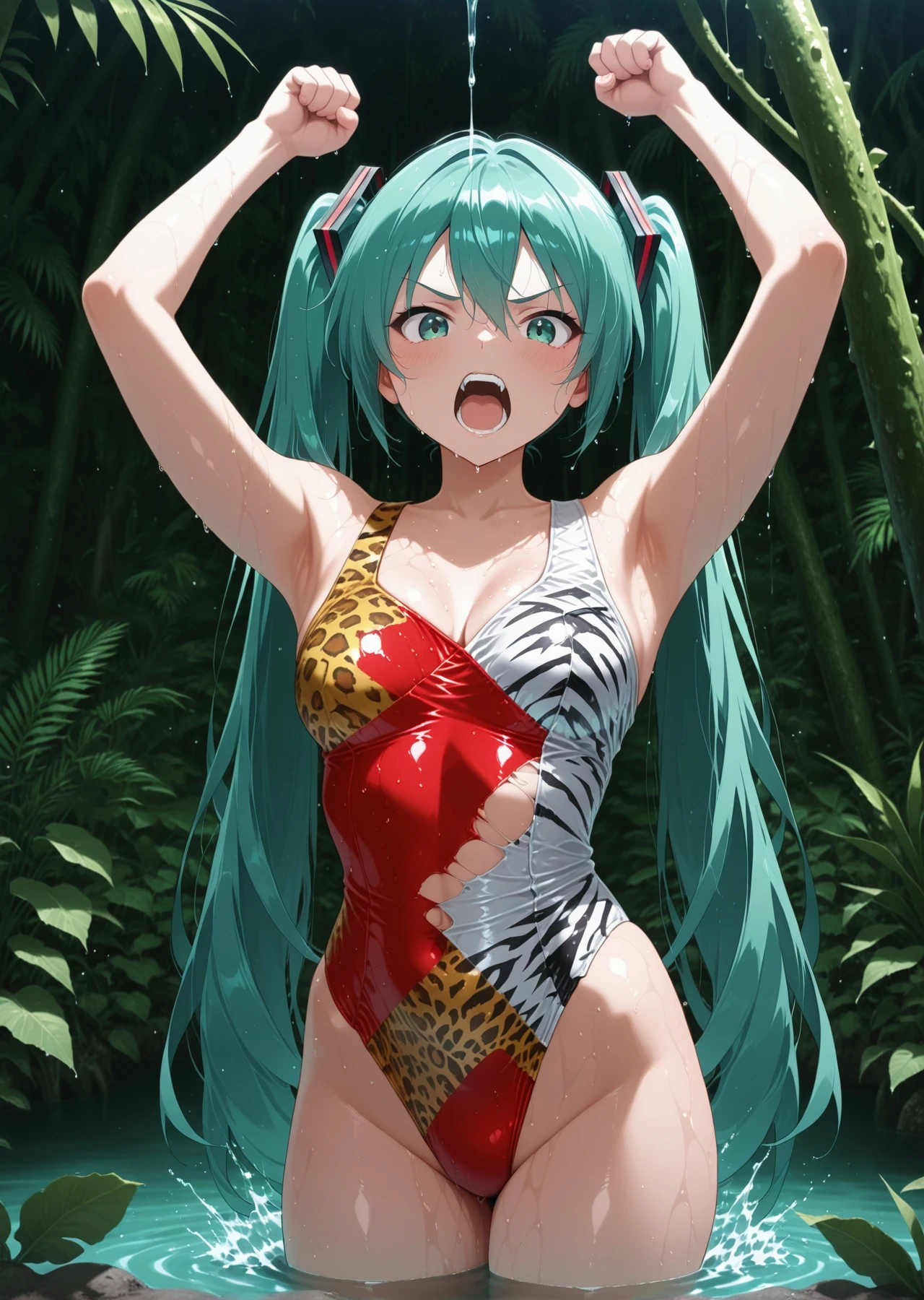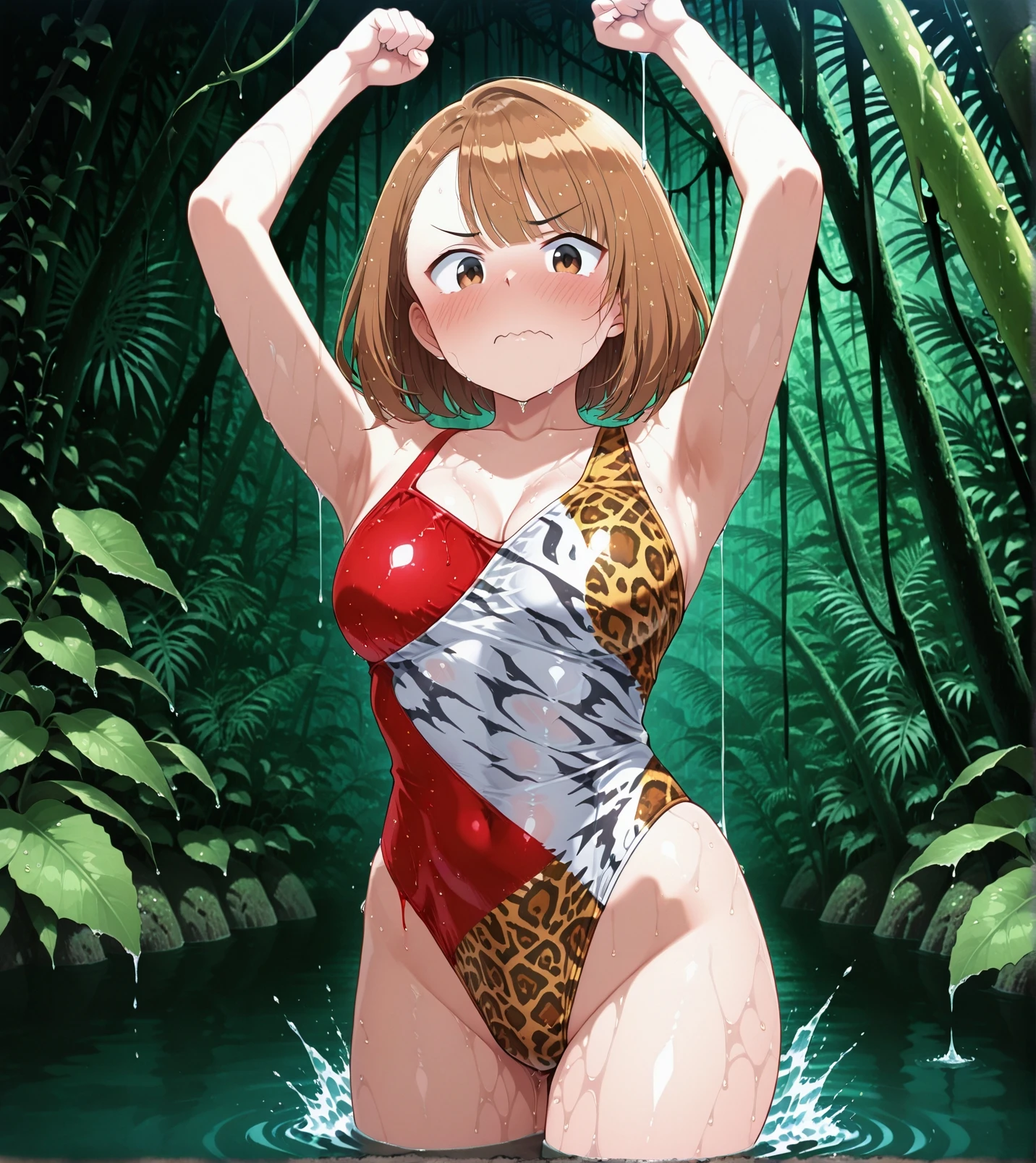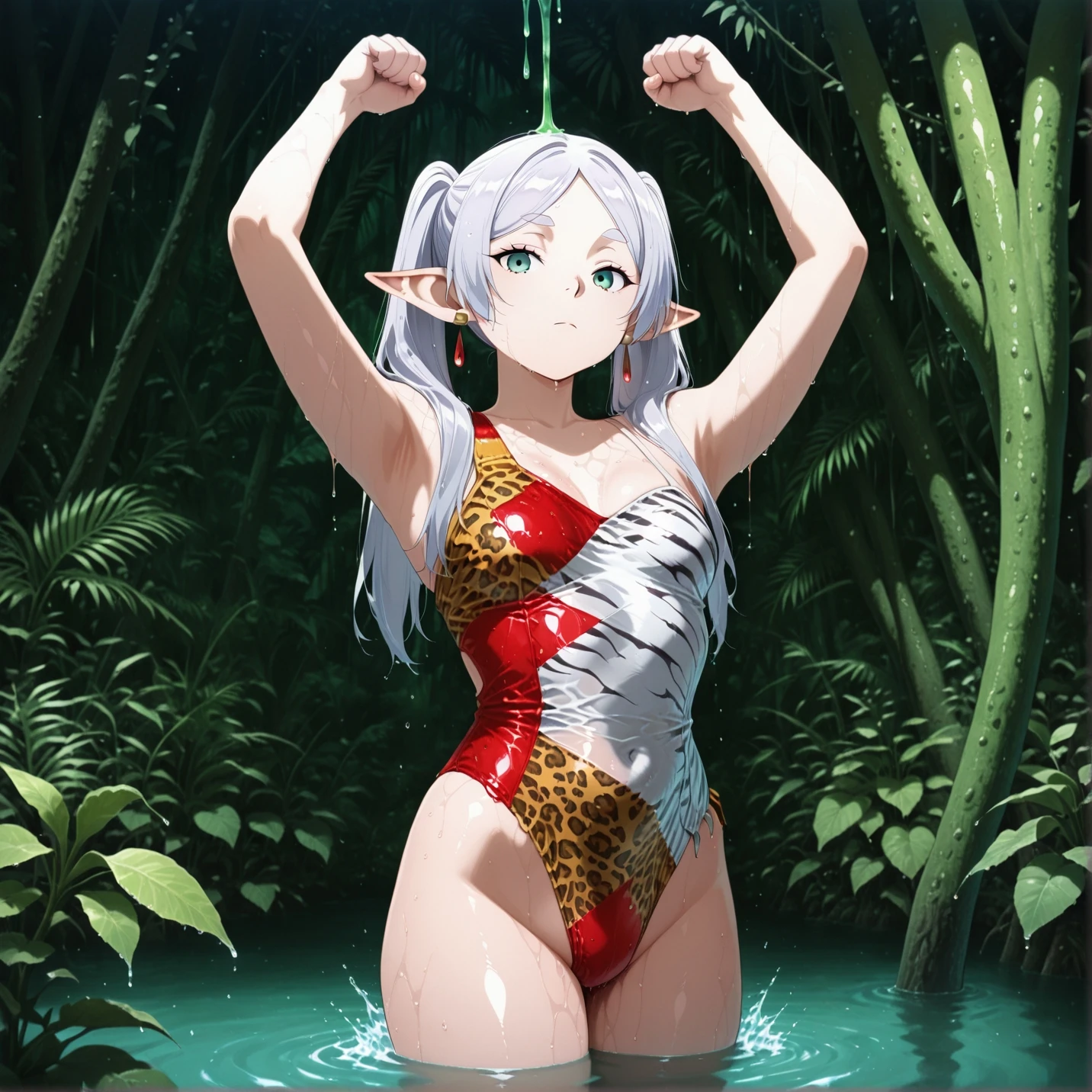 standing, looking at viewer,animal print,tiger print,zebra print, leopard print, white one-piece swimsuit,red one-piece swimsuit, partially submerged, multicolored swimsuit,one strap swinsuits,torn clothes,(dripping:1.5)