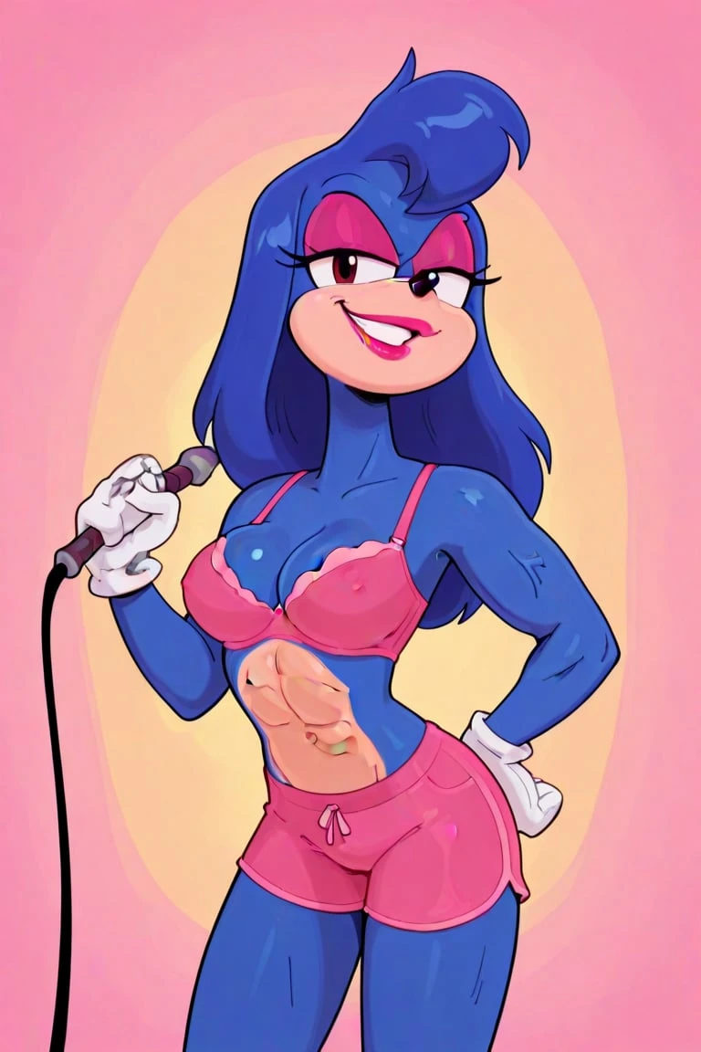 rule34, genderbent, hot girl, makeup, magenta eyeshadow, pink lipstick, long blue hair, long hair, blue body, white gloves, pink bra, erect nips, muscles, abs, pink shorts, magenta sneakers