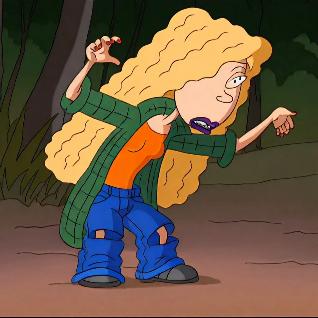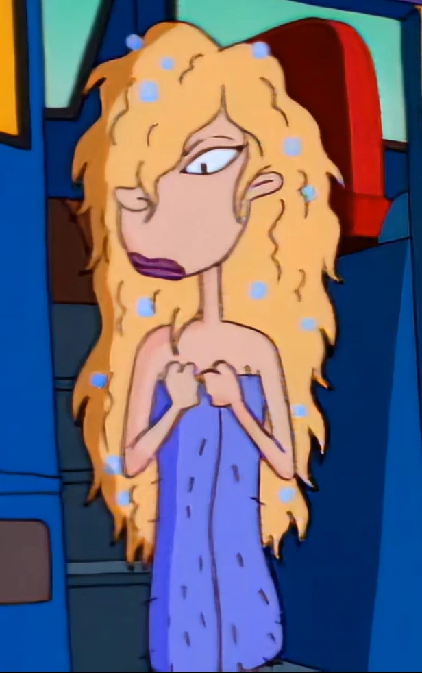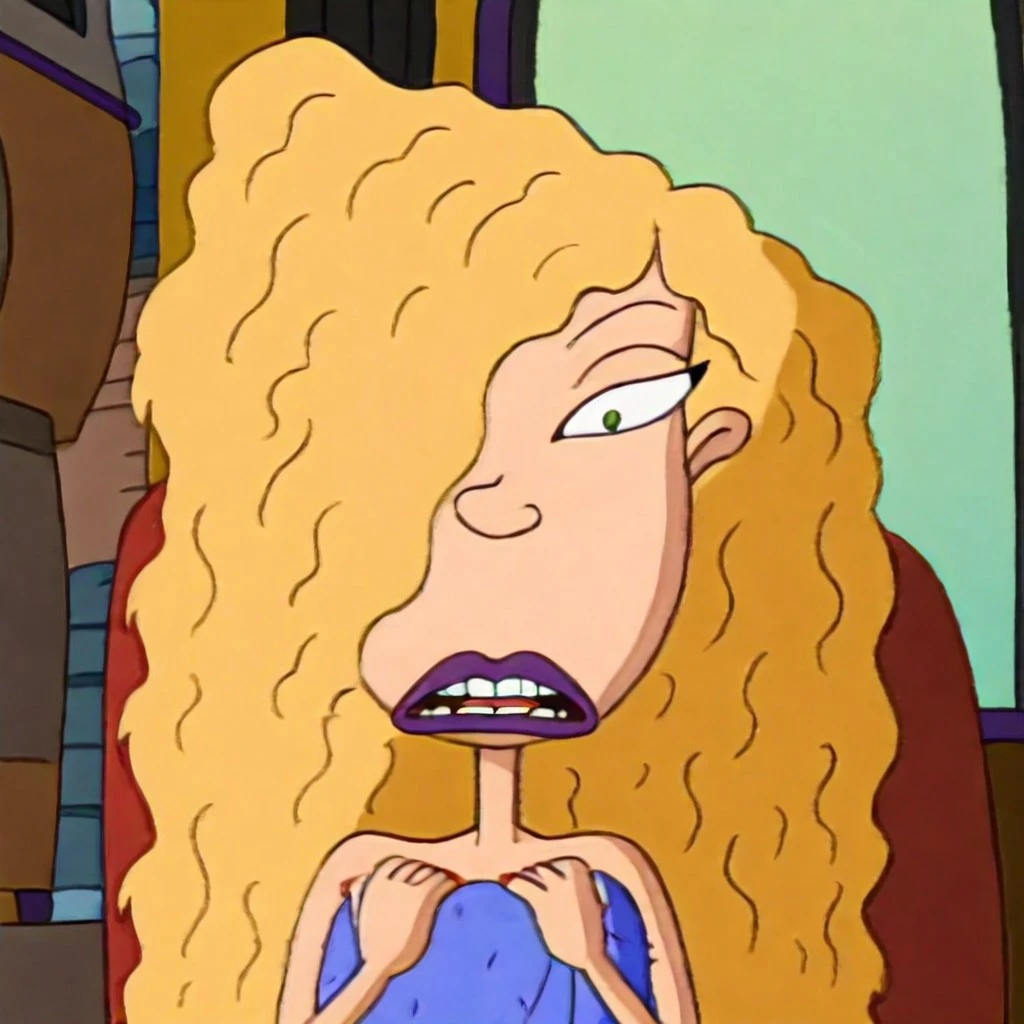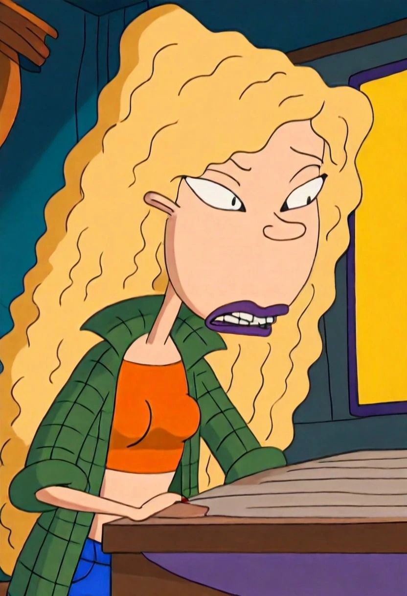 Debbie Thornberry, 1girl, long blonde hair, purple lipstick, red fingernails,