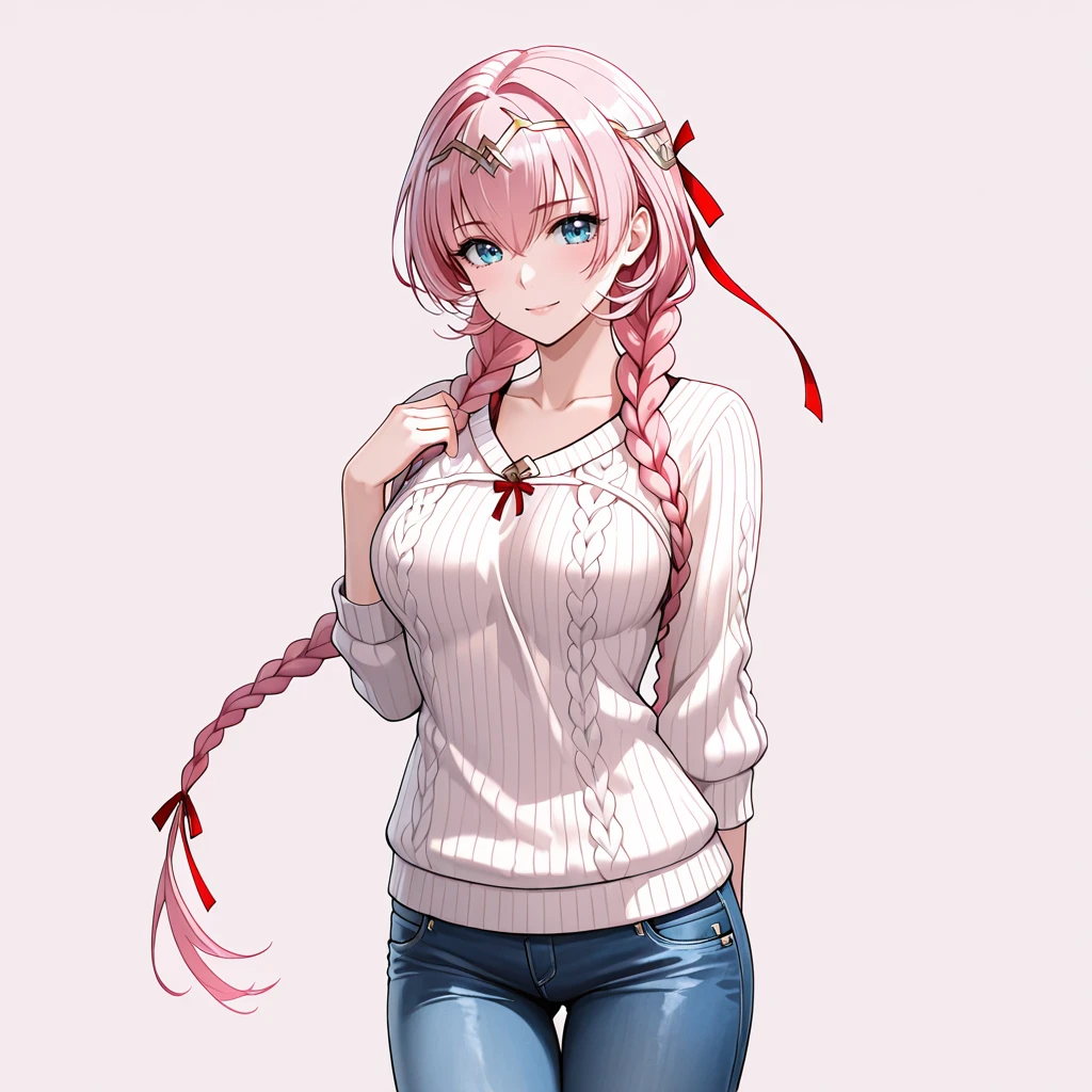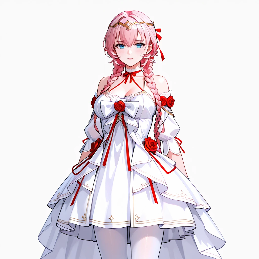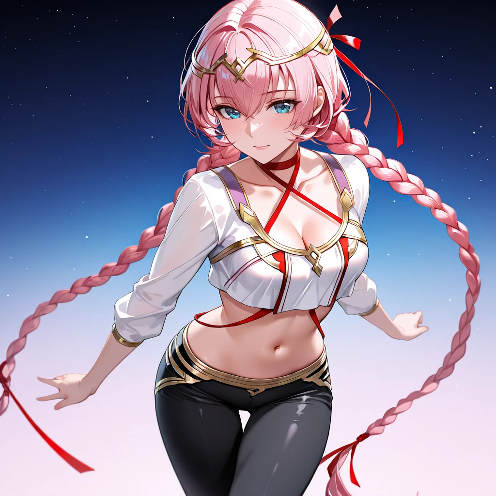 Trigger : Tenebria, 1girl, medium breasts, white shirt, pink hair, blue eyes, cleavage, braid, navel, twin braids, crop top, halterneck, hair ribbon, midriff, criss-cross halter, black pants, red choker, collarbone, red ribbon, thigh gap, stomach, long sleeves, circlet, bangs, collarbone