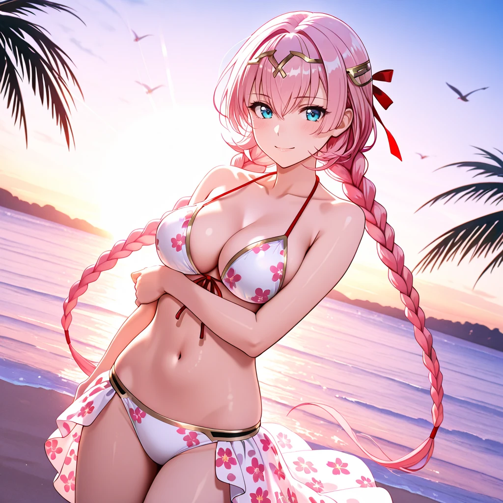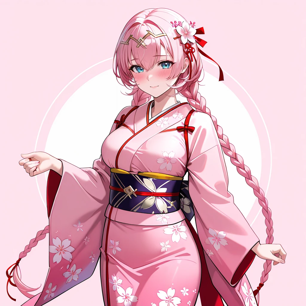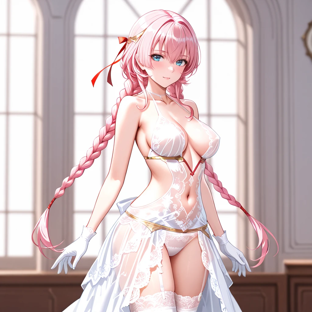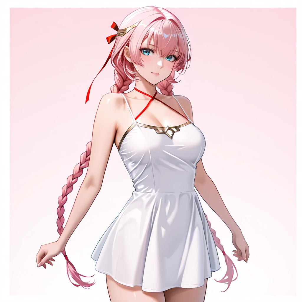 Trigger : Tenebria, 1girl, medium breasts, white shirt, pink hair, blue eyes, cleavage, braid, navel, twin braids, crop top, halterneck, hair ribbon, midriff, criss-cross halter, black pants, red choker, collarbone, red ribbon, thigh gap, stomach, long sleeves, circlet, bangs, collarbone