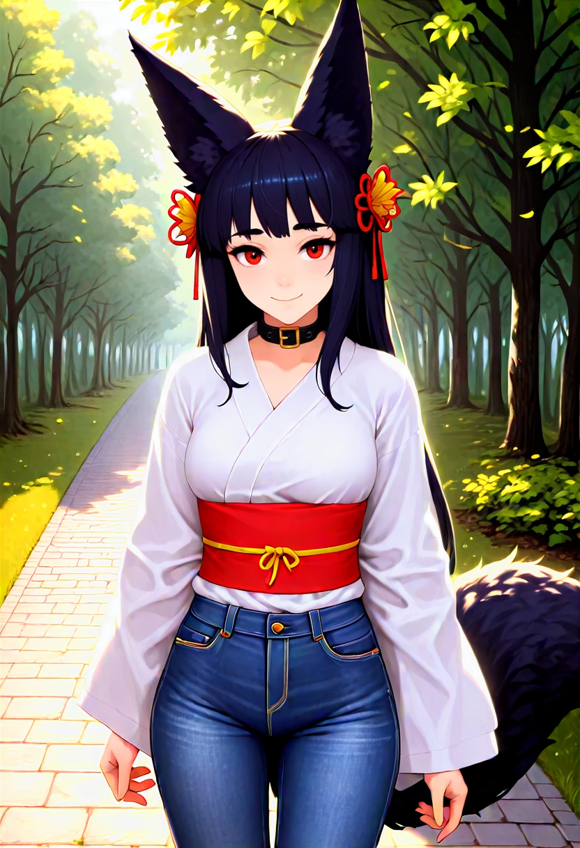 yuelgbf, animal ears, black hair, erune, fox ears, fox tail, long hair, red eyes, fox girl, tail, Description
