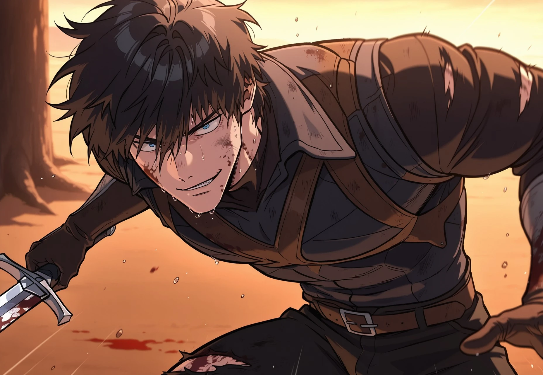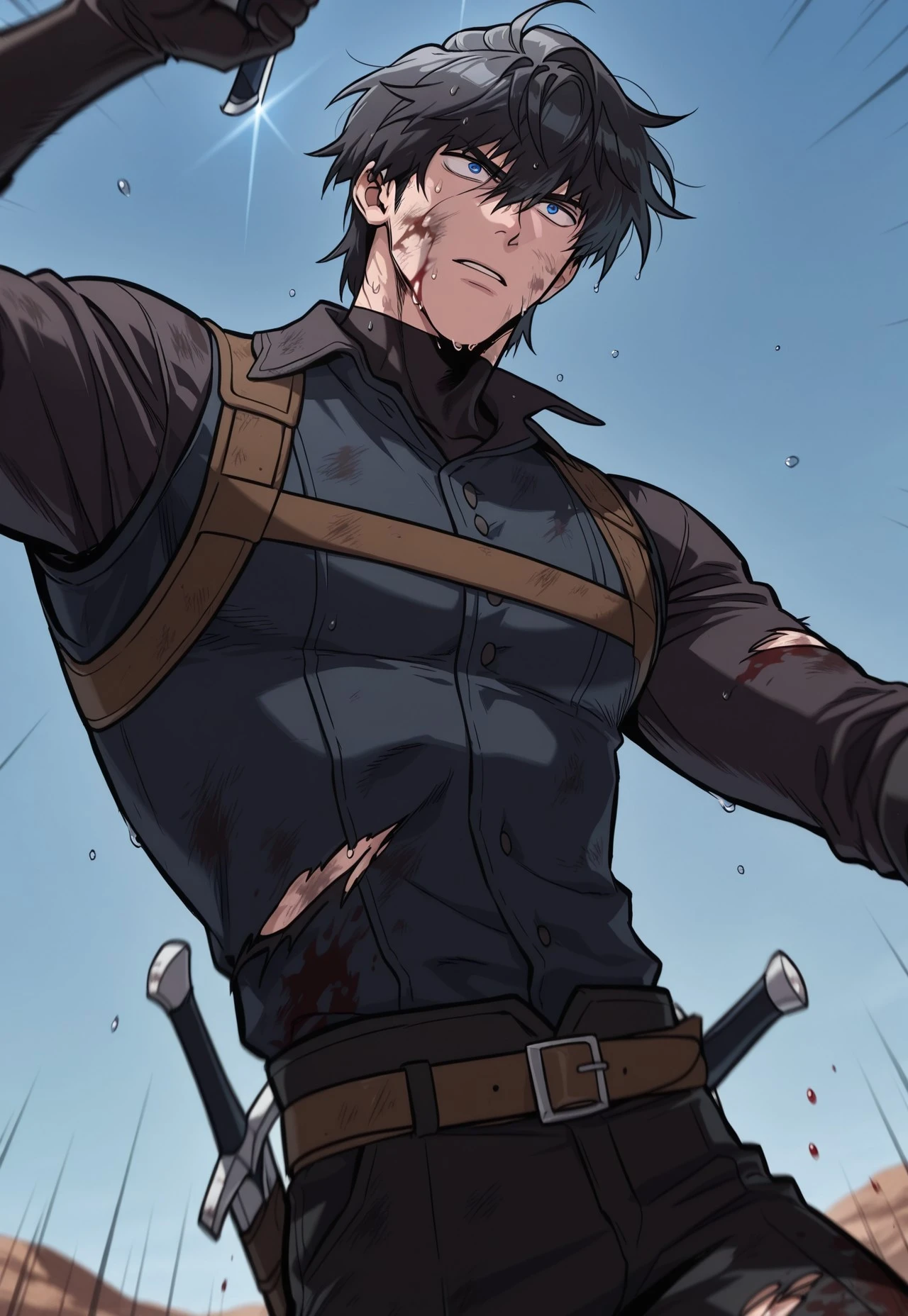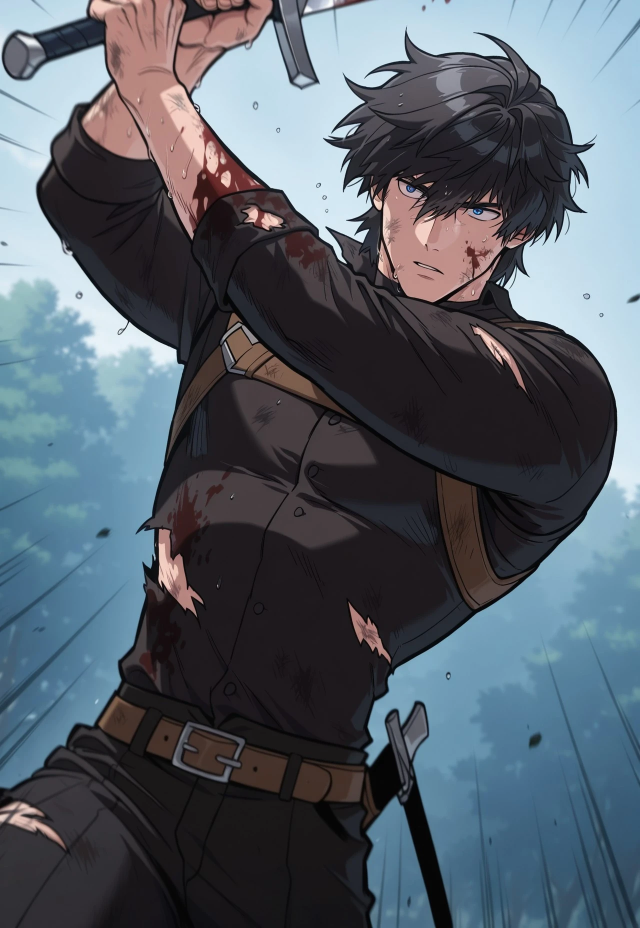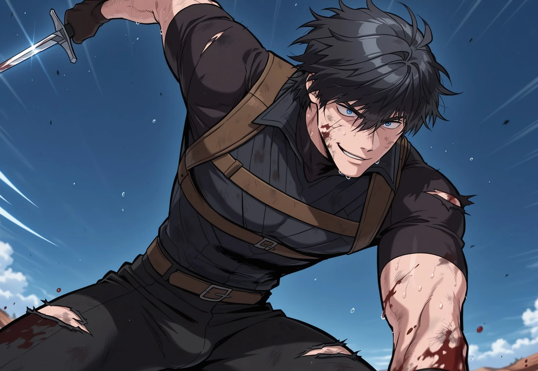 Encrid, blue eyes, black hair, hair between eyes, black shirt, sleeveless, bangs