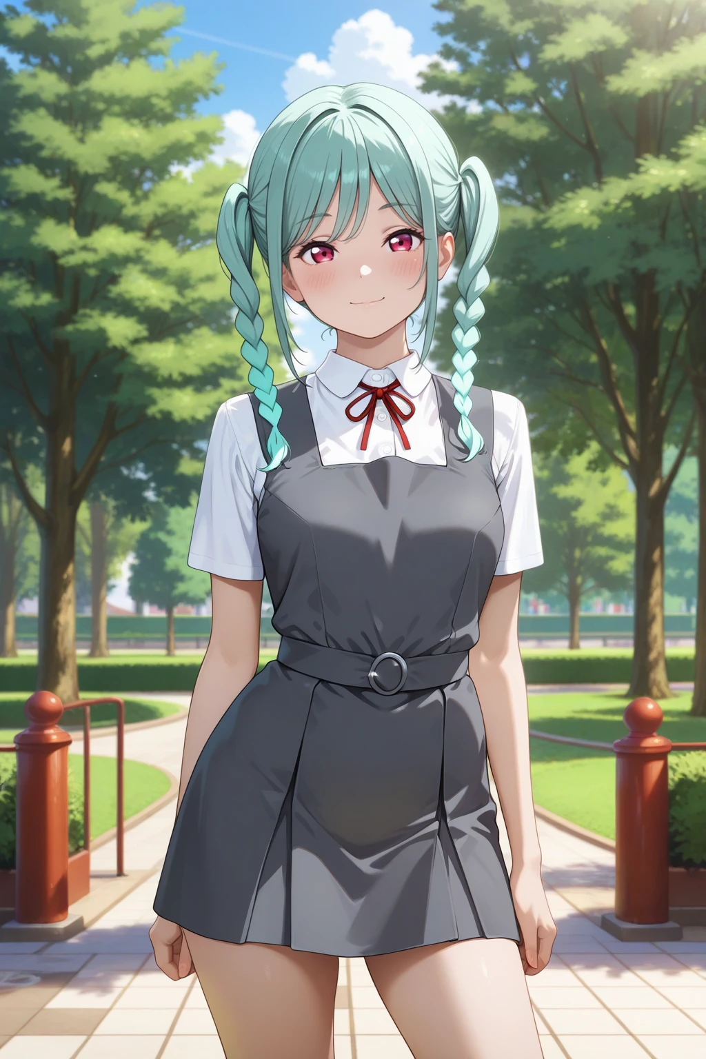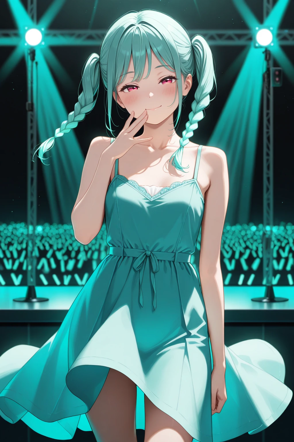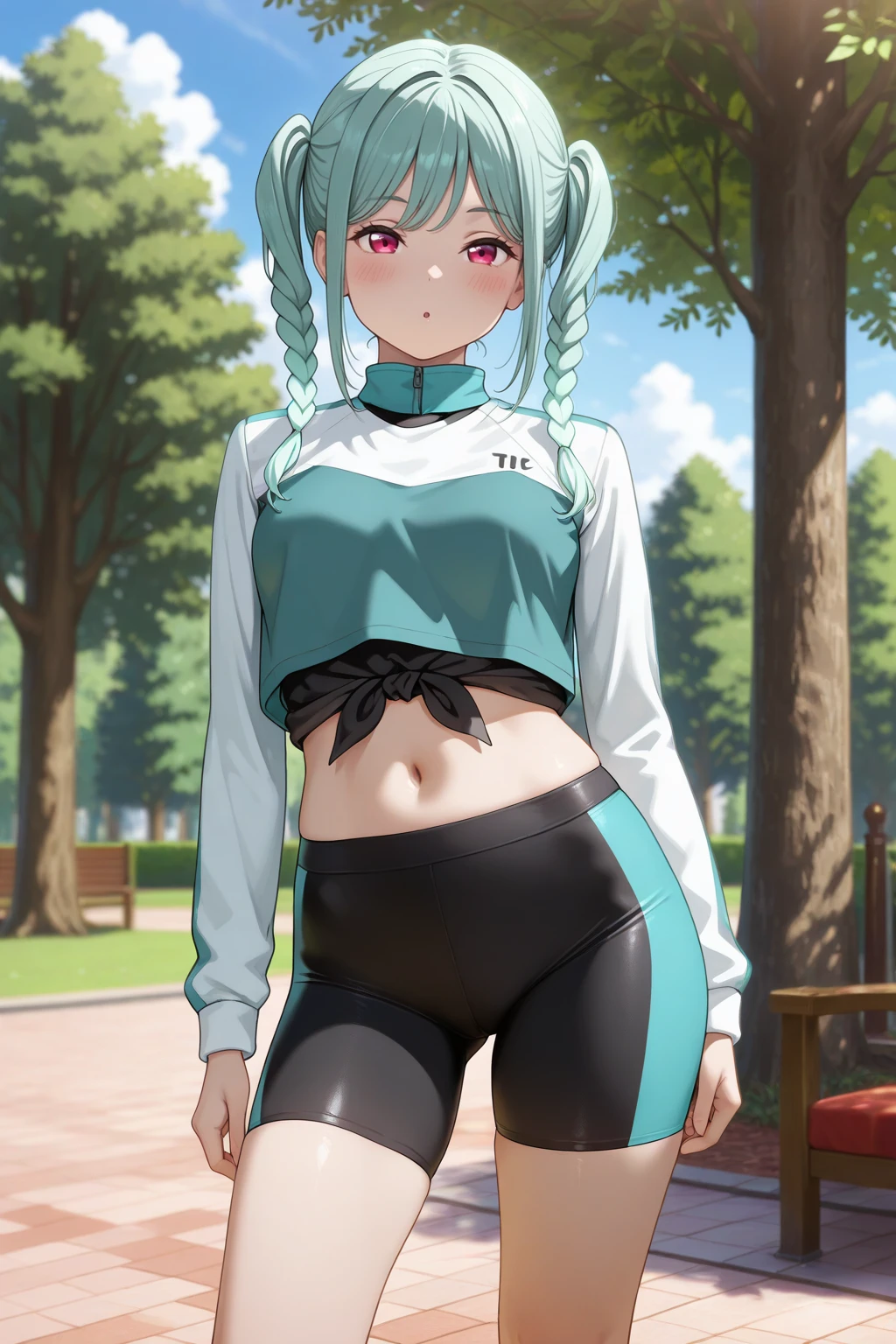 tomari, aqua hair, twin braids, long hair, magenta eyes,