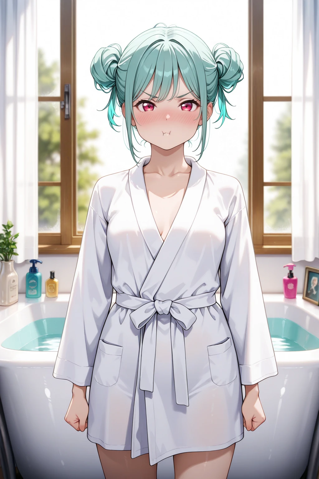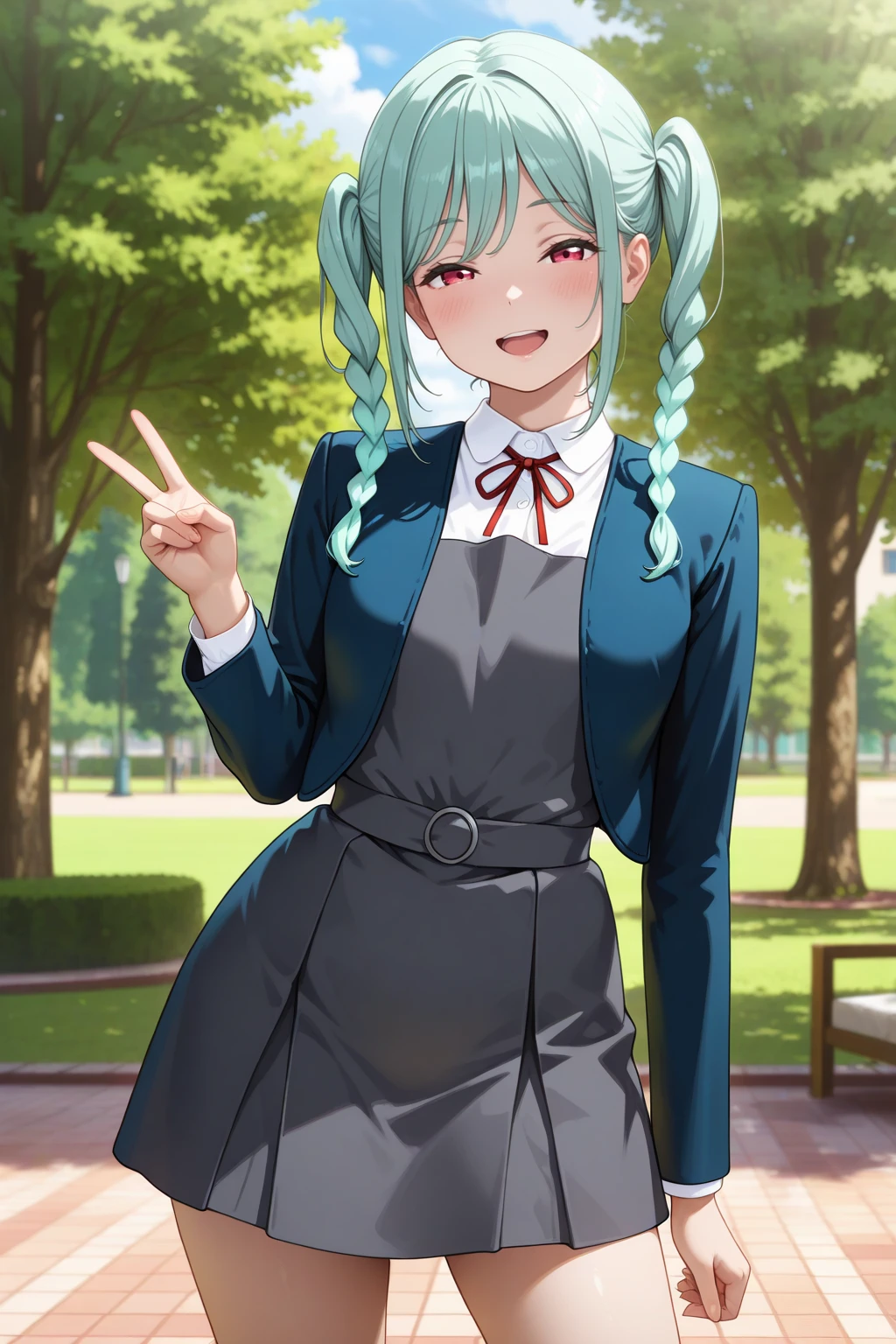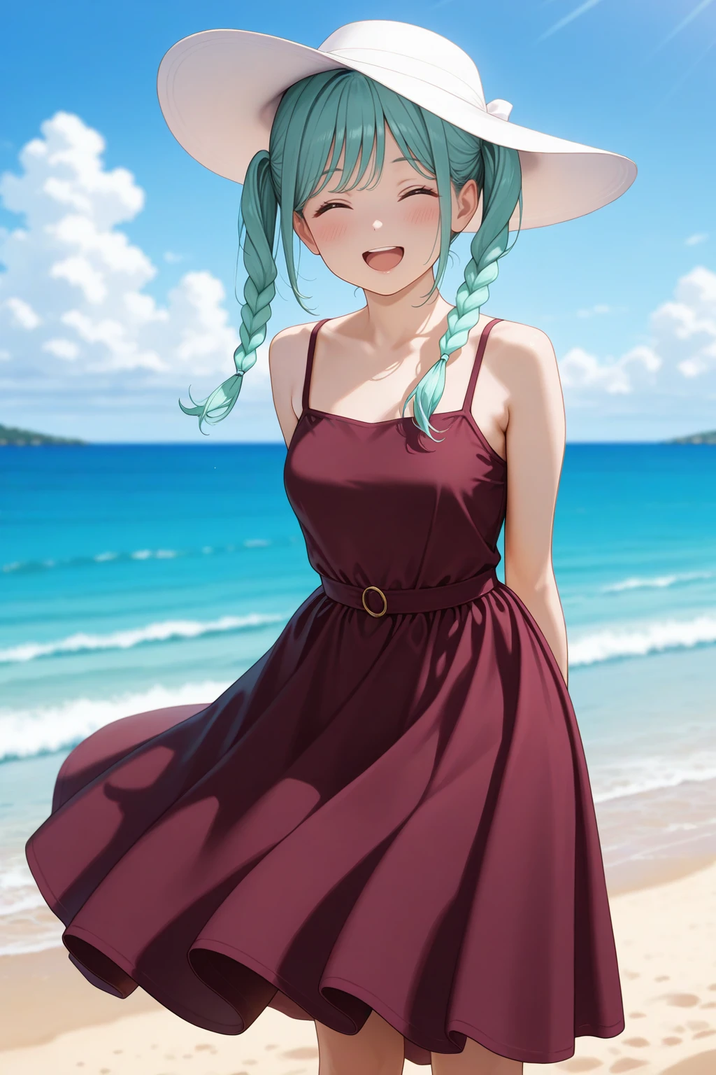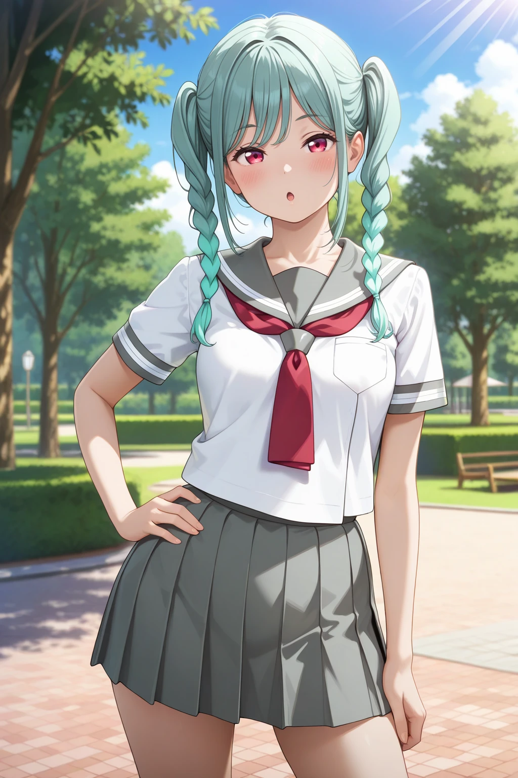 tomari, aqua hair, twin braids, long hair, magenta eyes,