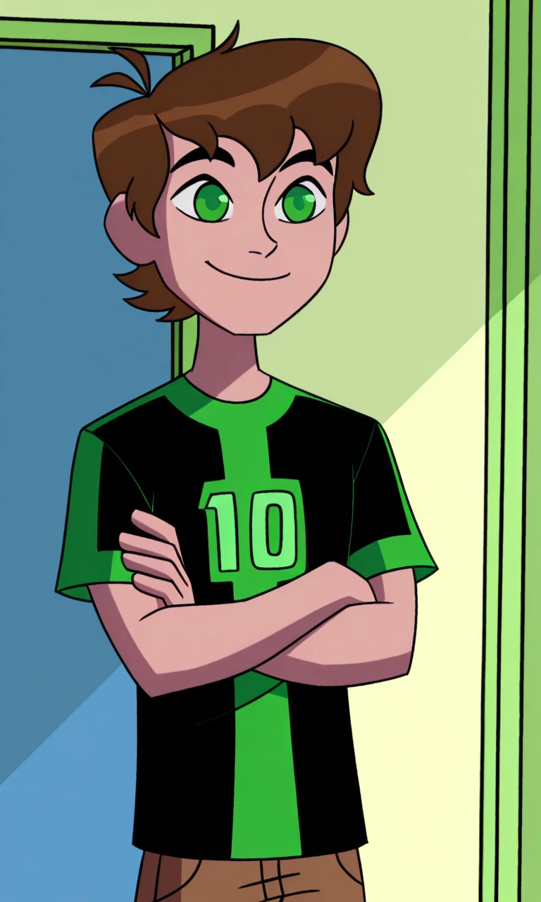 OvBenTennyson,1boy,solo,brown hair,short hair,green eyes,short sleeves, black shirt,green stripes on shirt,10 number on shirt,short sleeves,brown pants