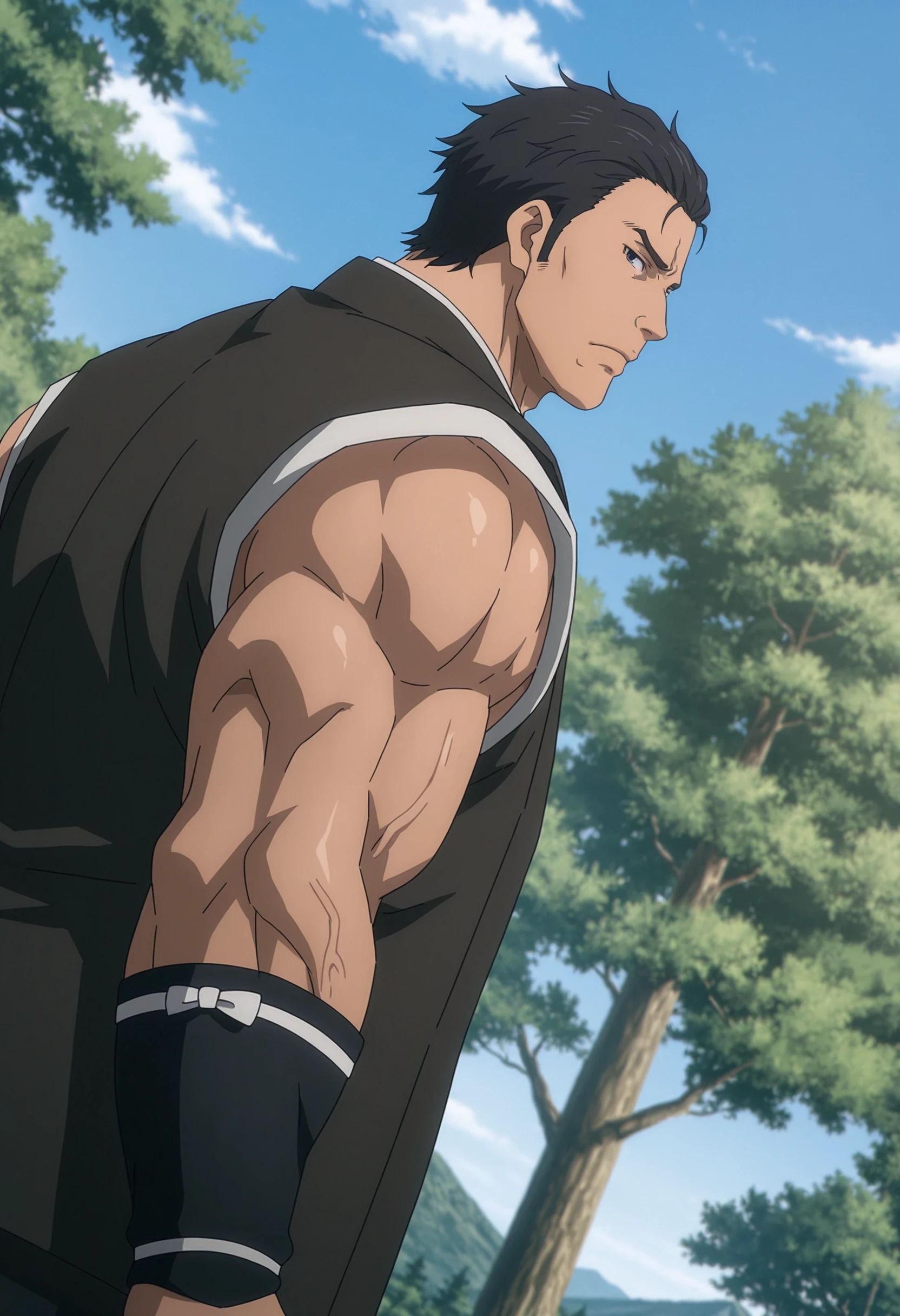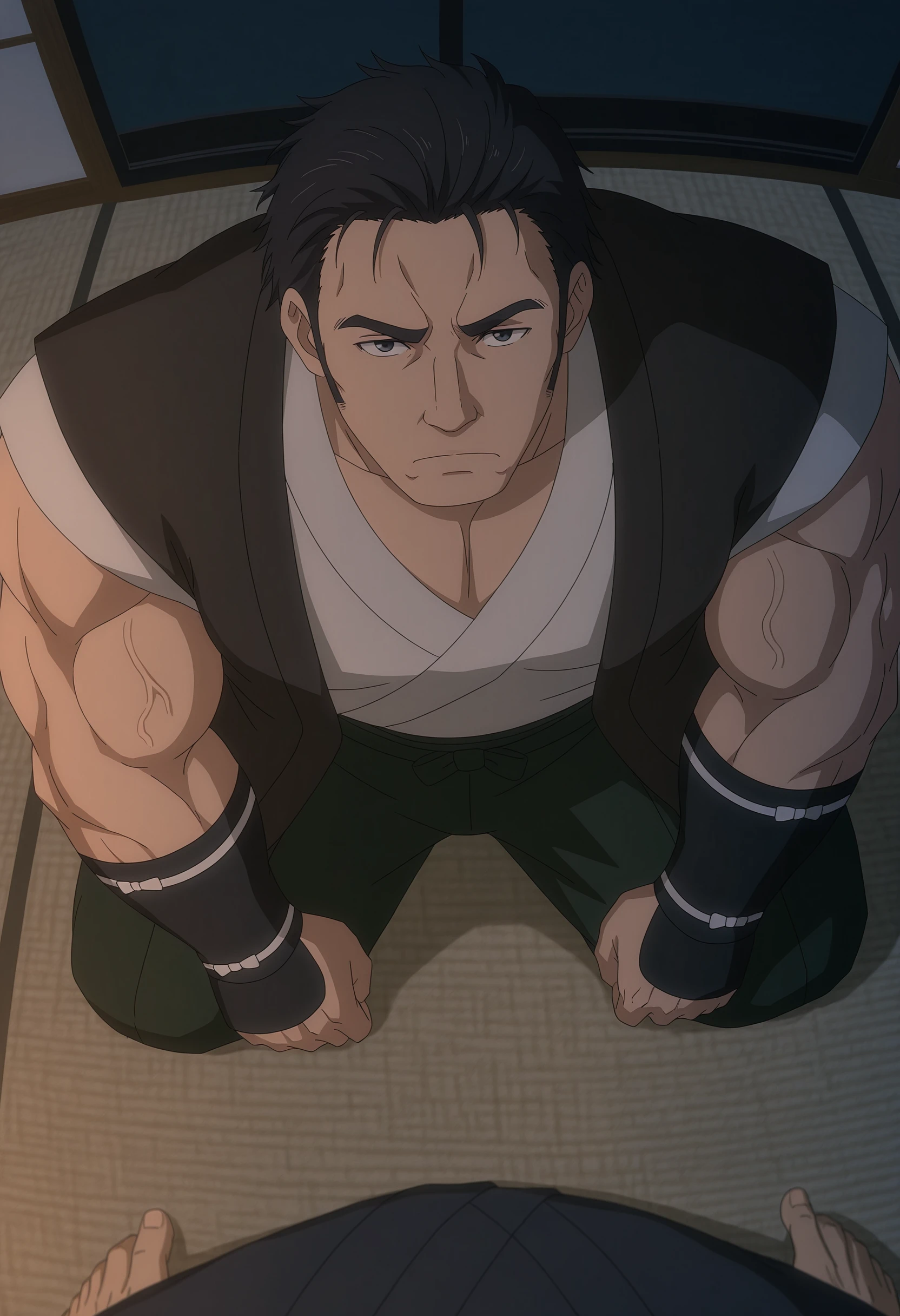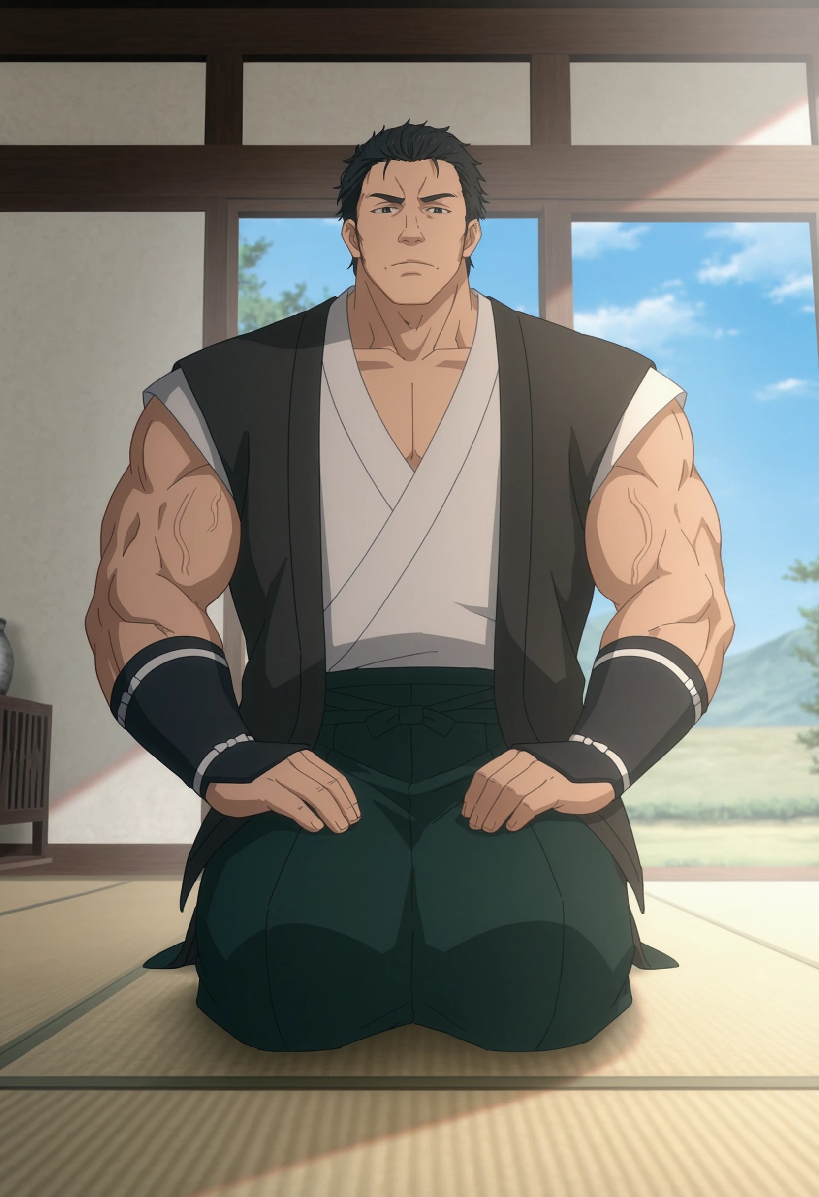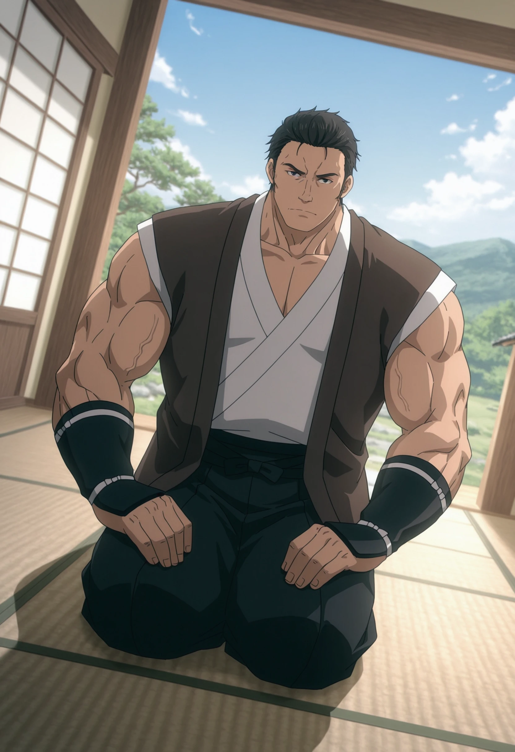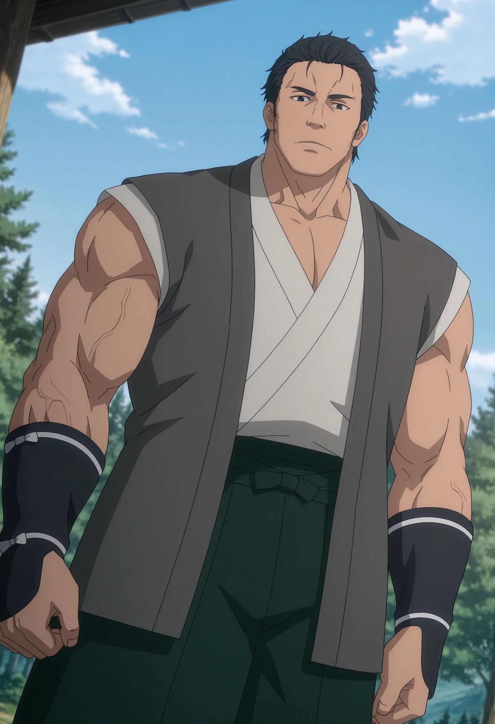 short hair, black hair, black eyes, japanese clothes, sleeveless, grey vest, black wristbands