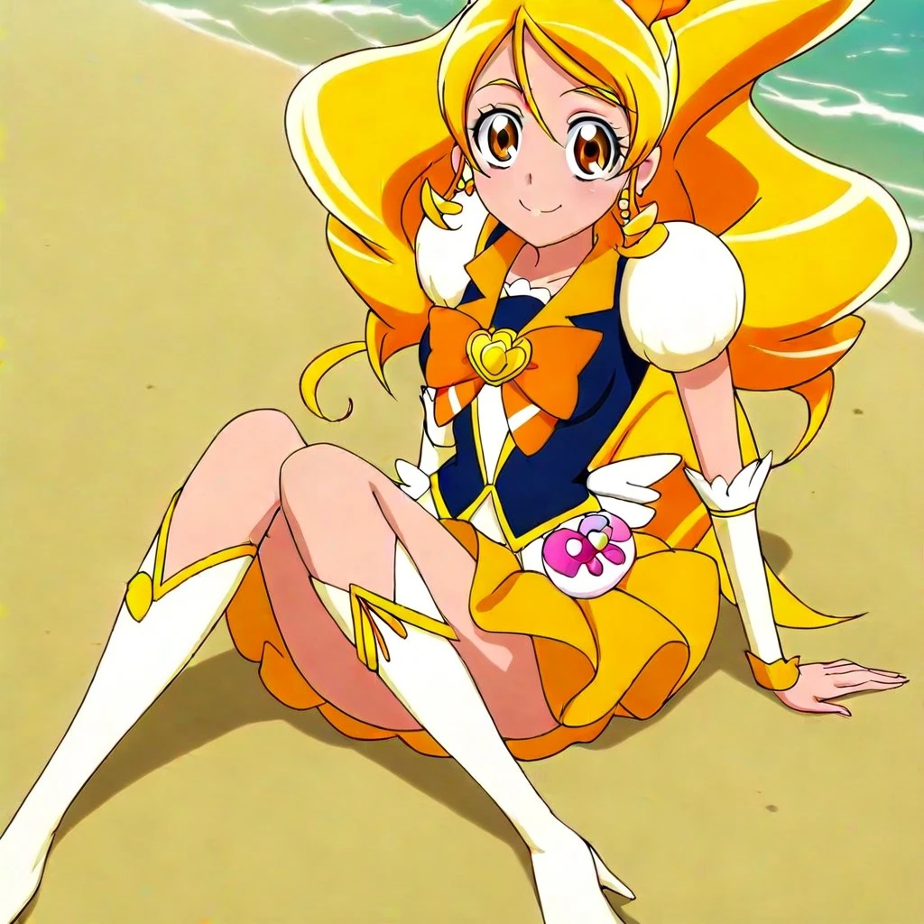 cure honey \(precure\), blonde hair, long hair, bangs, brown eyes, hairbow, earrings, jewelry, magical girl outfit, skirt, bow, multicolored dress, wrist cuffs, heels, large breasts, 1girl, solo