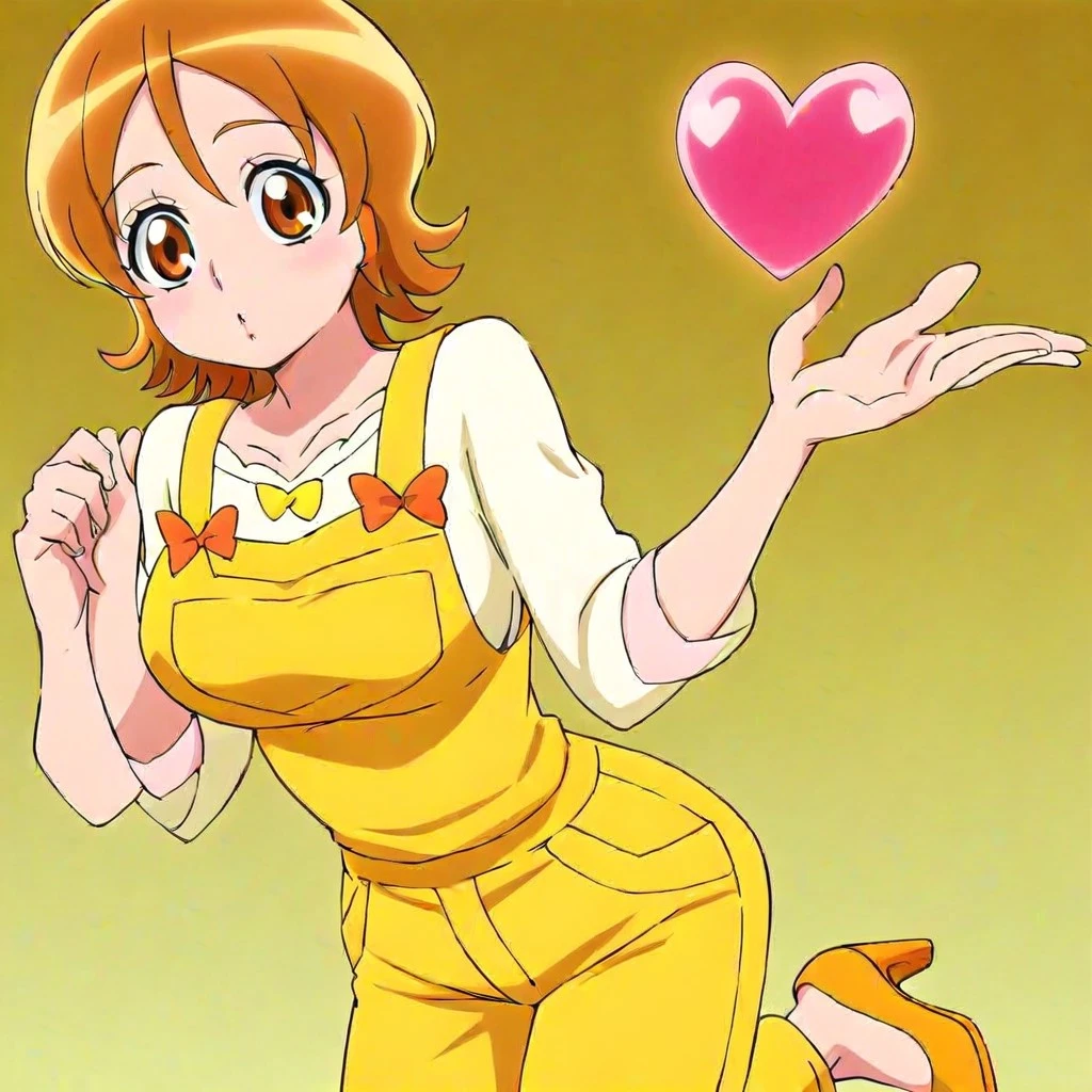 yuko omori \(precure\), brown hair, short hair, bangs, brown eyes, yellow overalls, white undershirt, bow, heels, large breasts, 1girl, solo