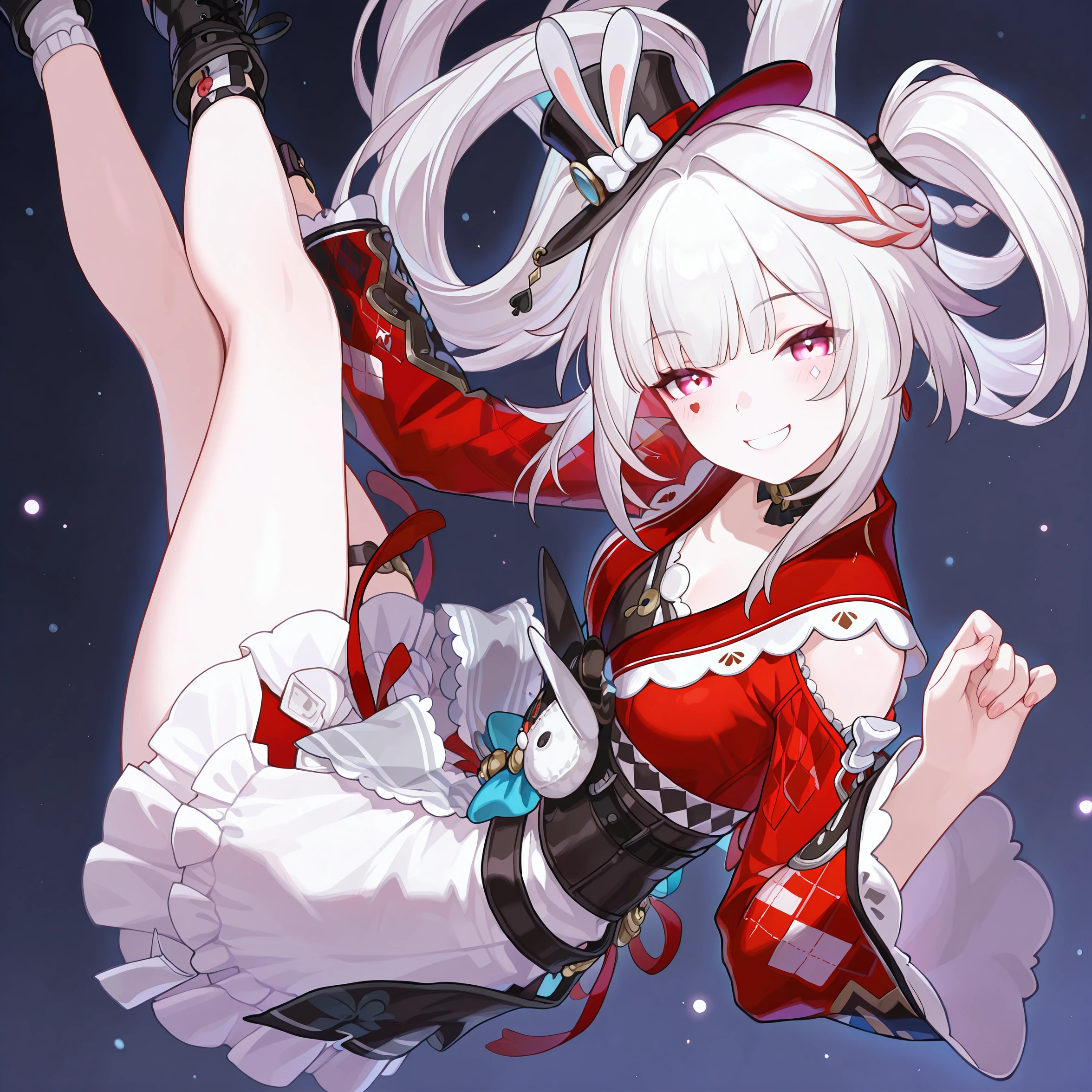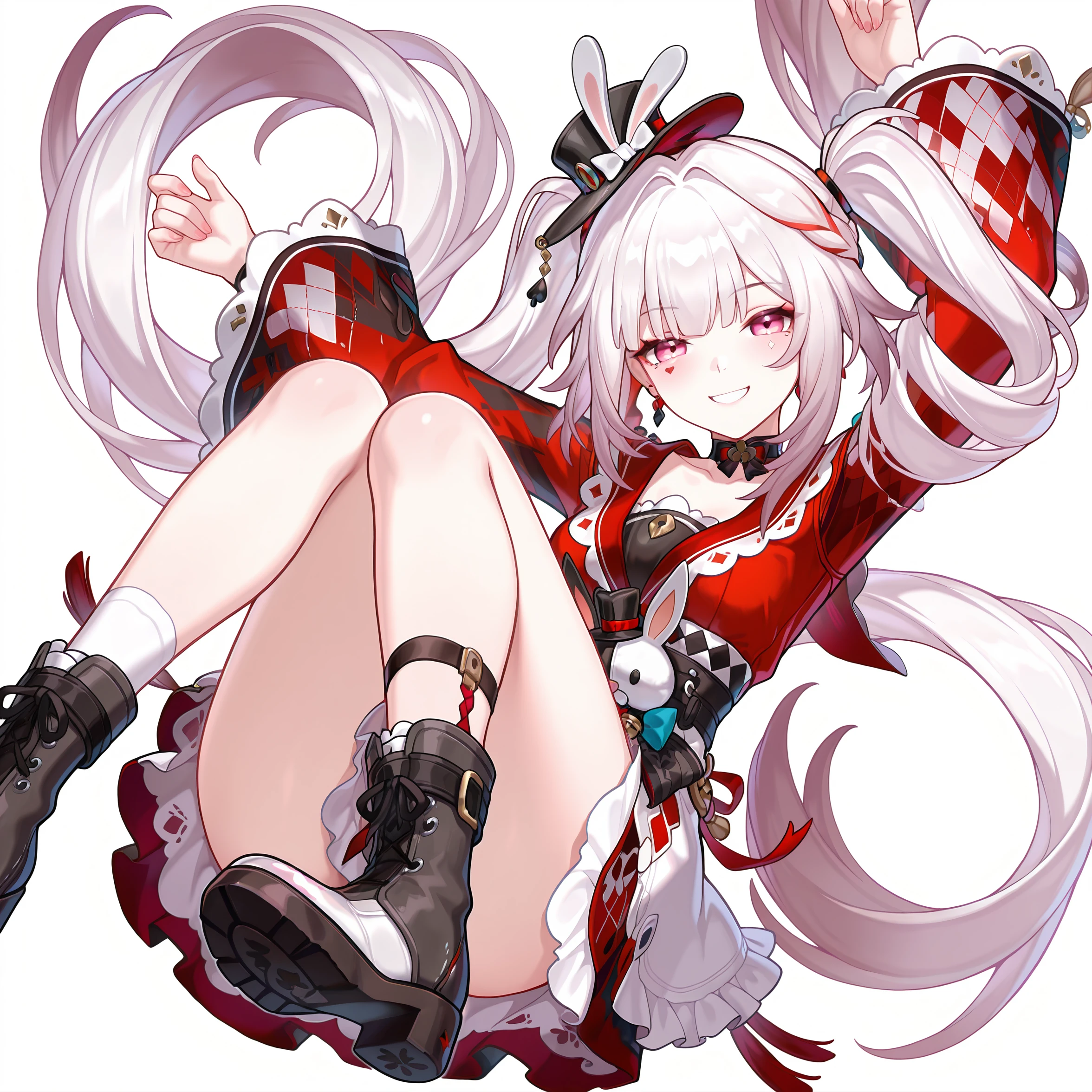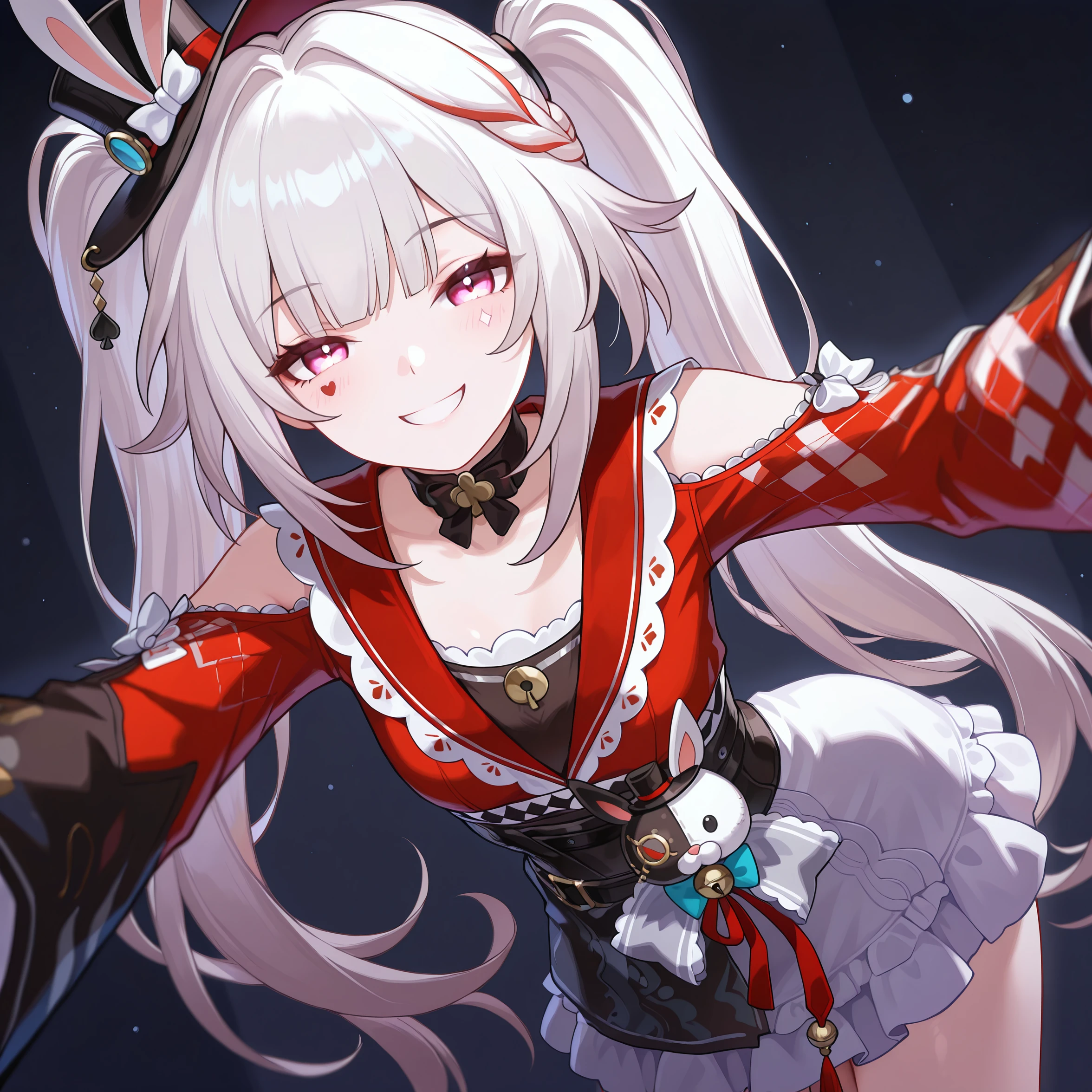 hat, dress, choker, gloves, boots, earrings。更换服装: 实测下来我在我常用的checkpoint模型上在去掉上述官方服装提示词后,可以自由添加任意喜欢的服装元素。如果你在使用其他checkpoint模型推理时仍发现有官方服装残留,建议将上述标签加入到负面提示词中。