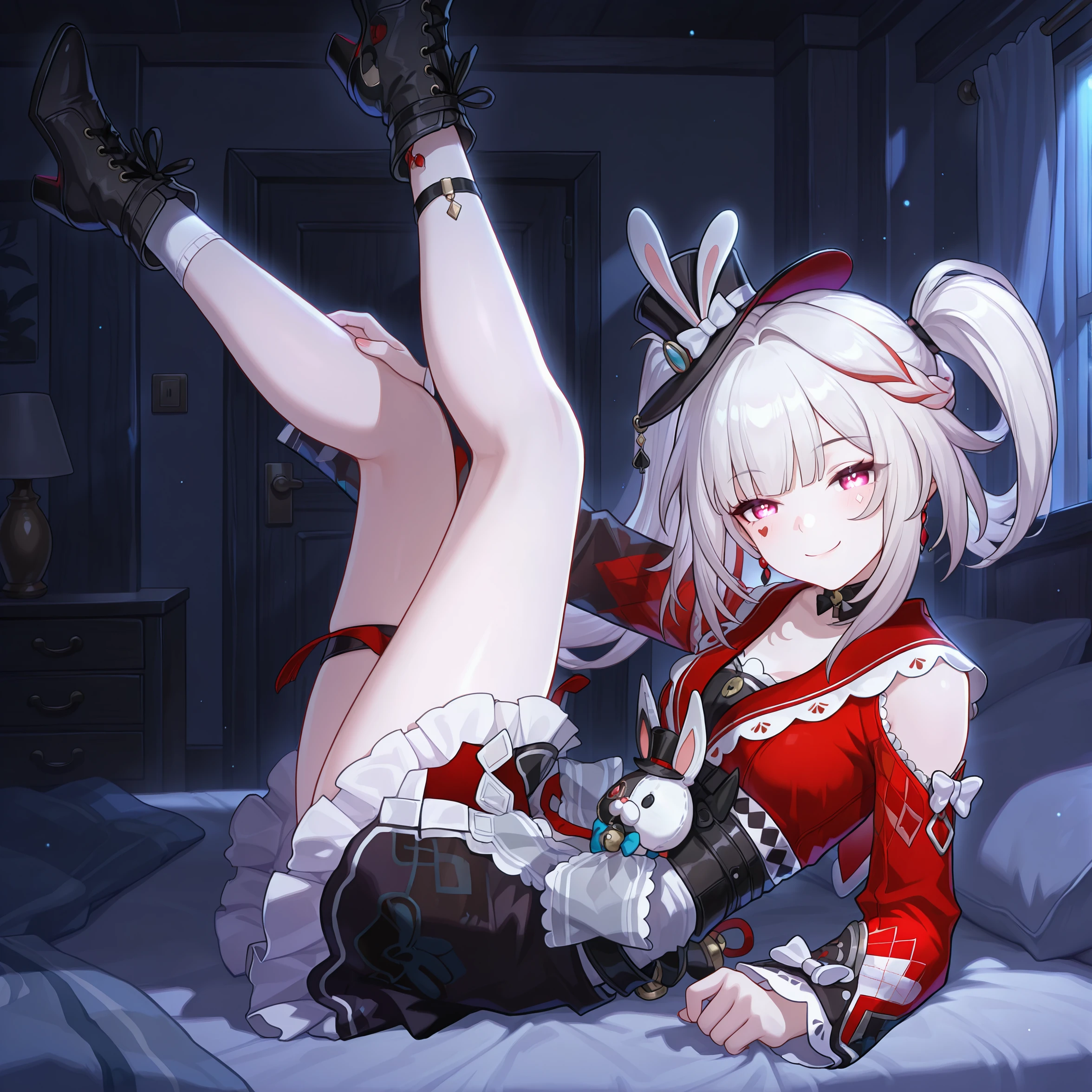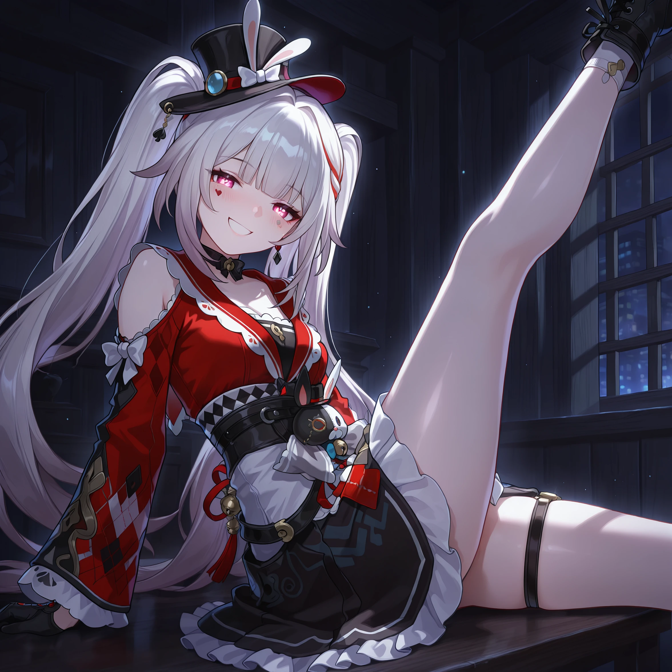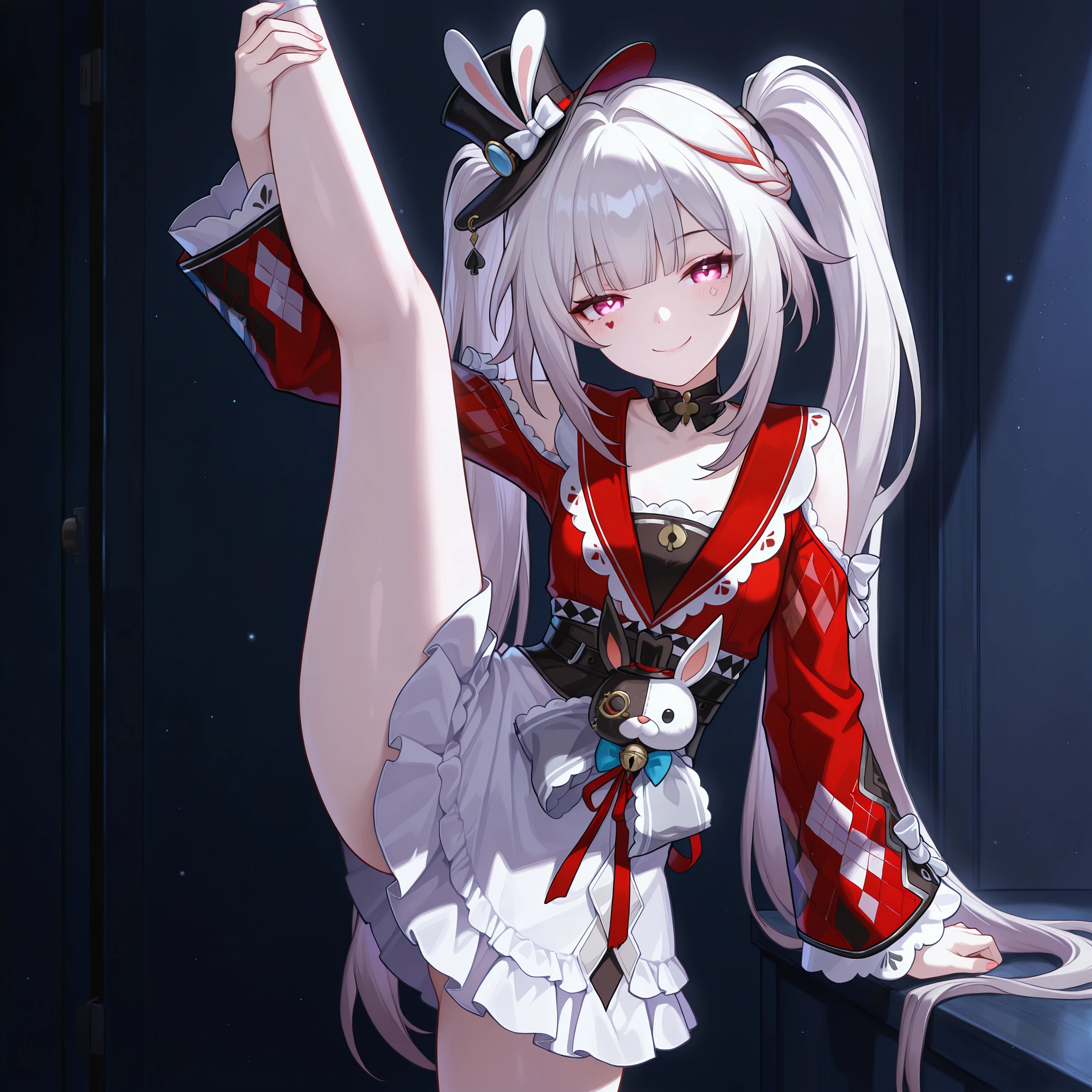 hat, dress, choker, gloves, boots, earrings。更换服装: 实测下来我在我常用的checkpoint模型上在去掉上述官方服装提示词后,可以自由添加任意喜欢的服装元素。如果你在使用其他checkpoint模型推理时仍发现有官方服装残留,建议将上述标签加入到负面提示词中。