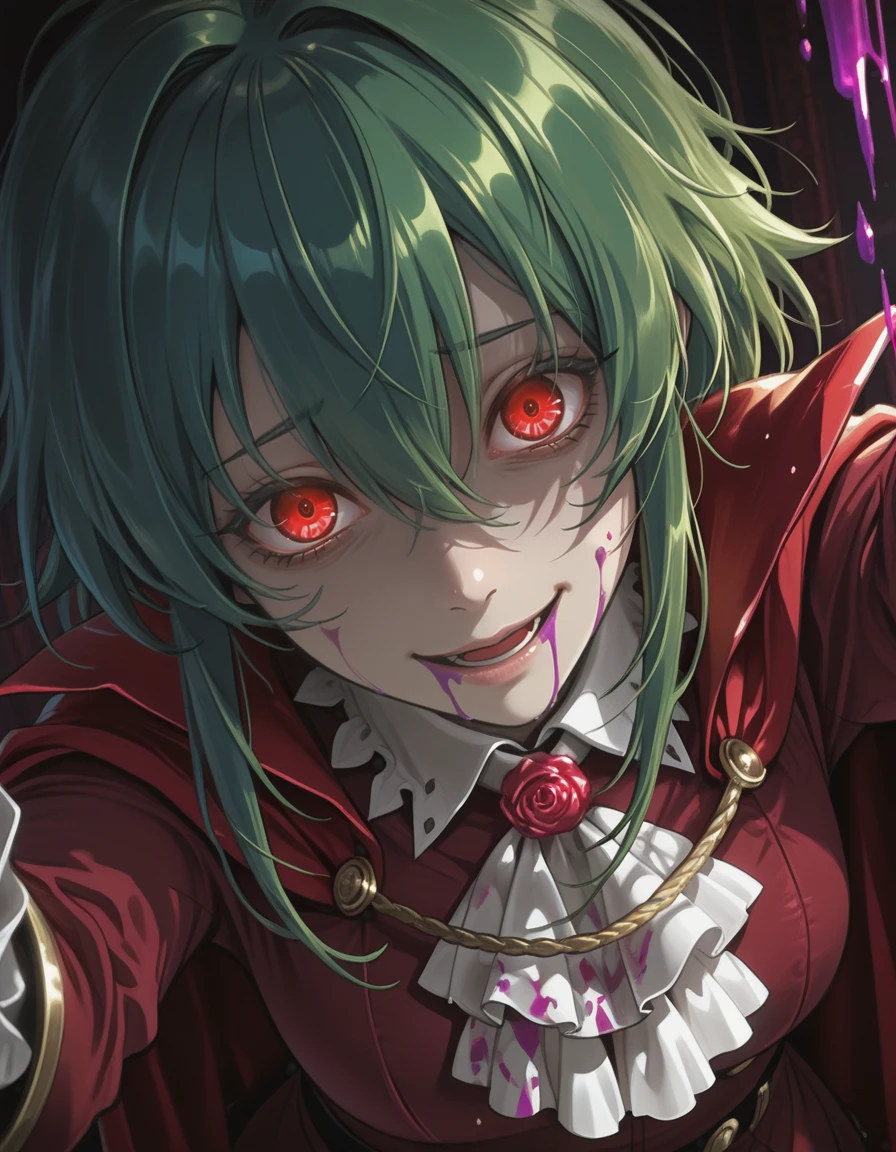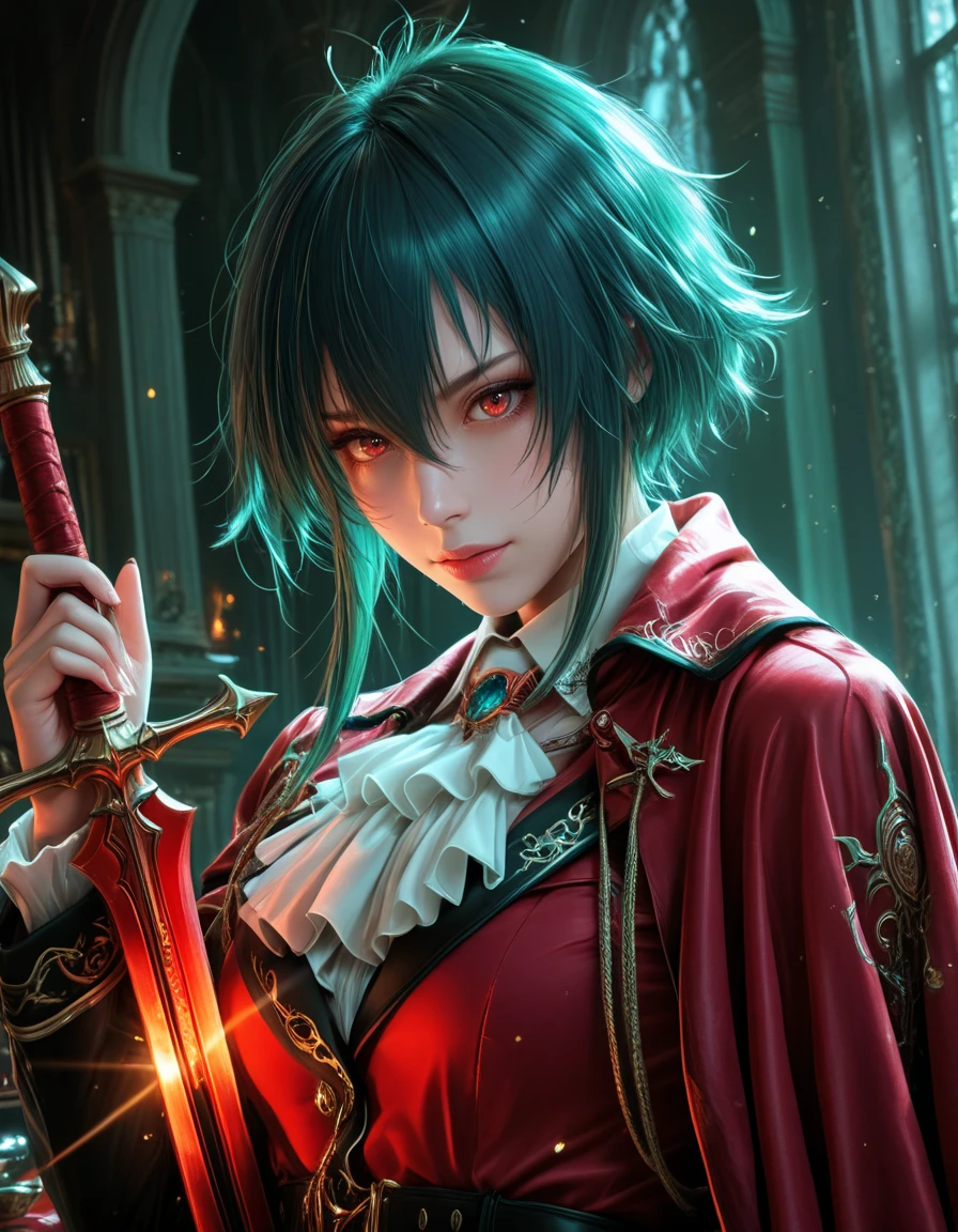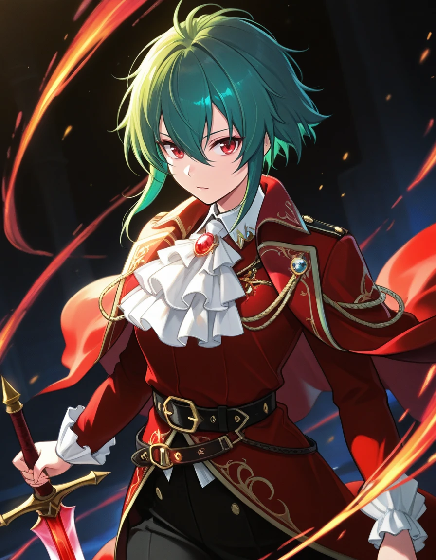white ascot,belt,red cape,long sleeves,red gemstone,weapon
