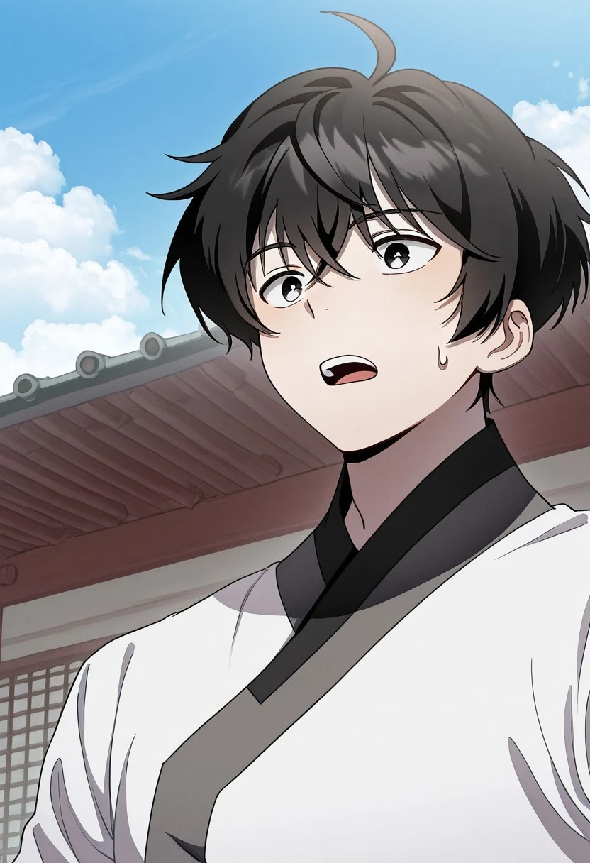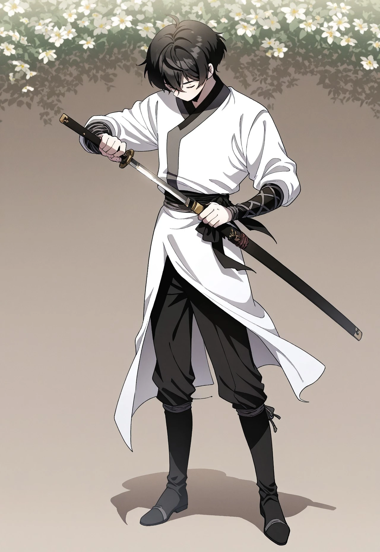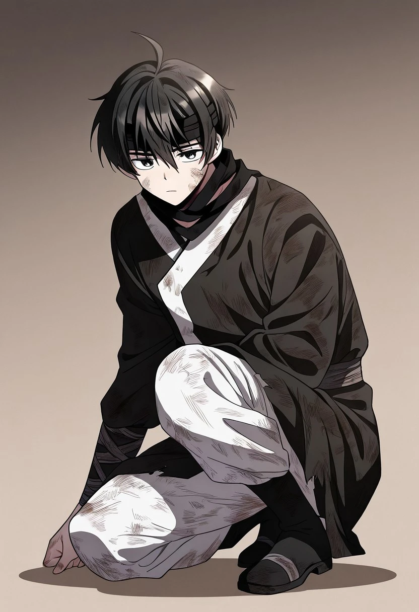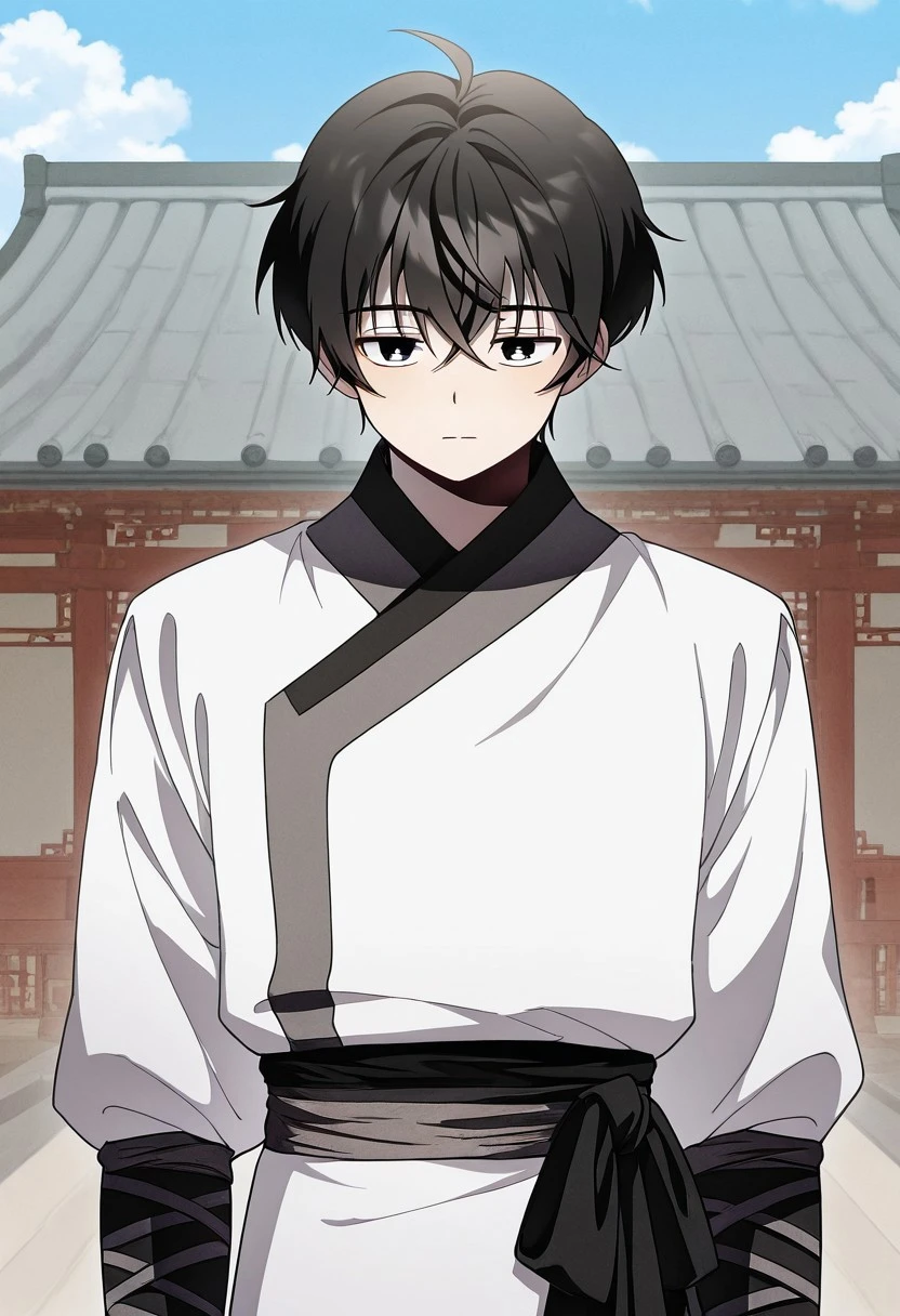 1boy, male focus, solo, black eyes, black hair, white dobok, waist sash, wrist guards, black pants, boots, black footwear,