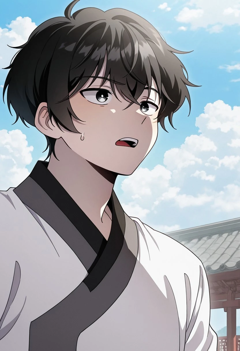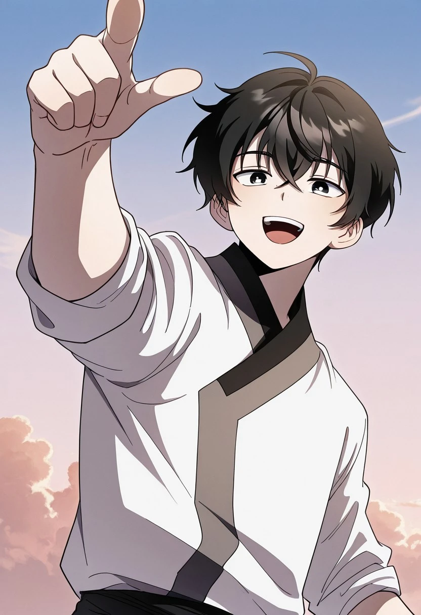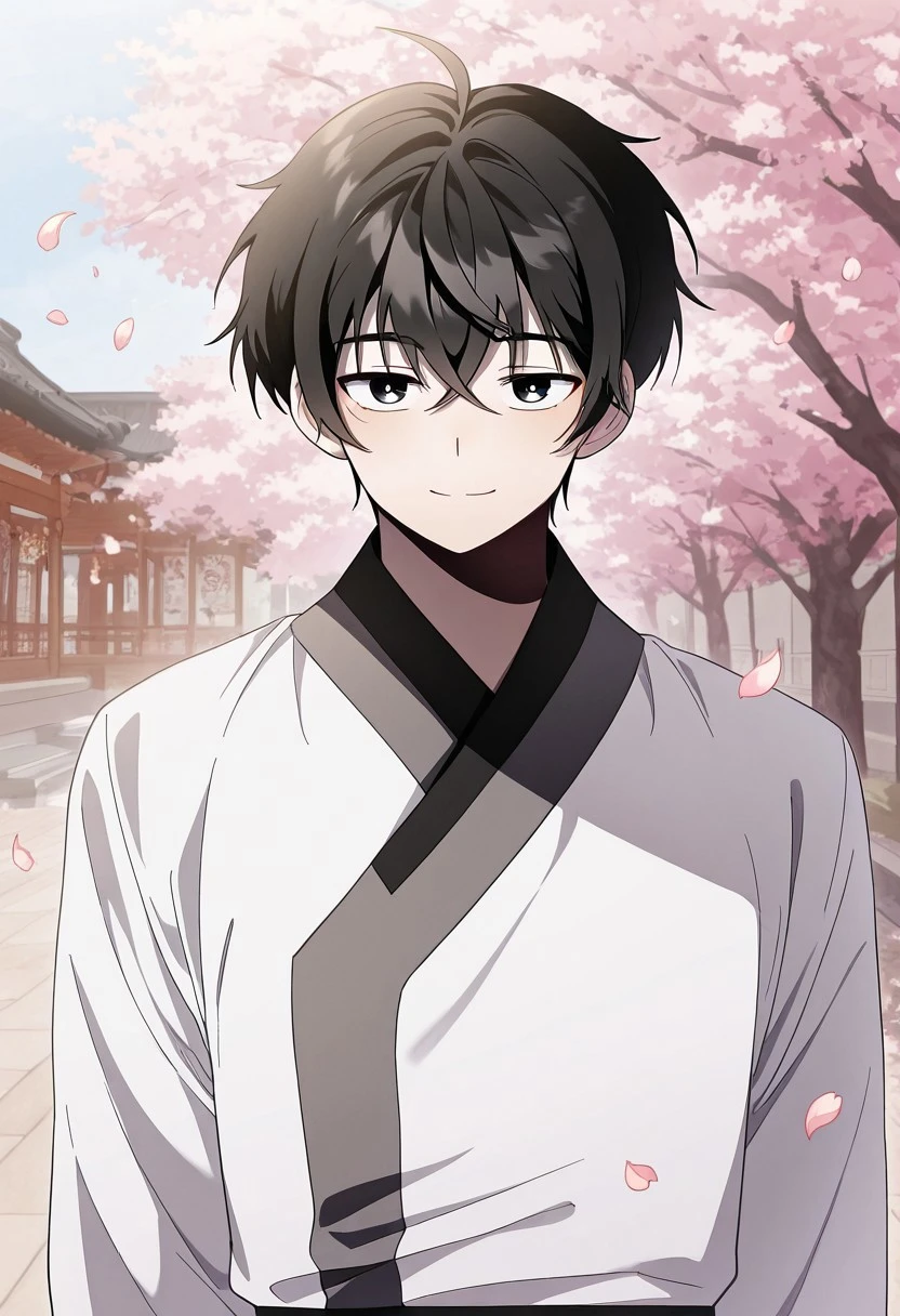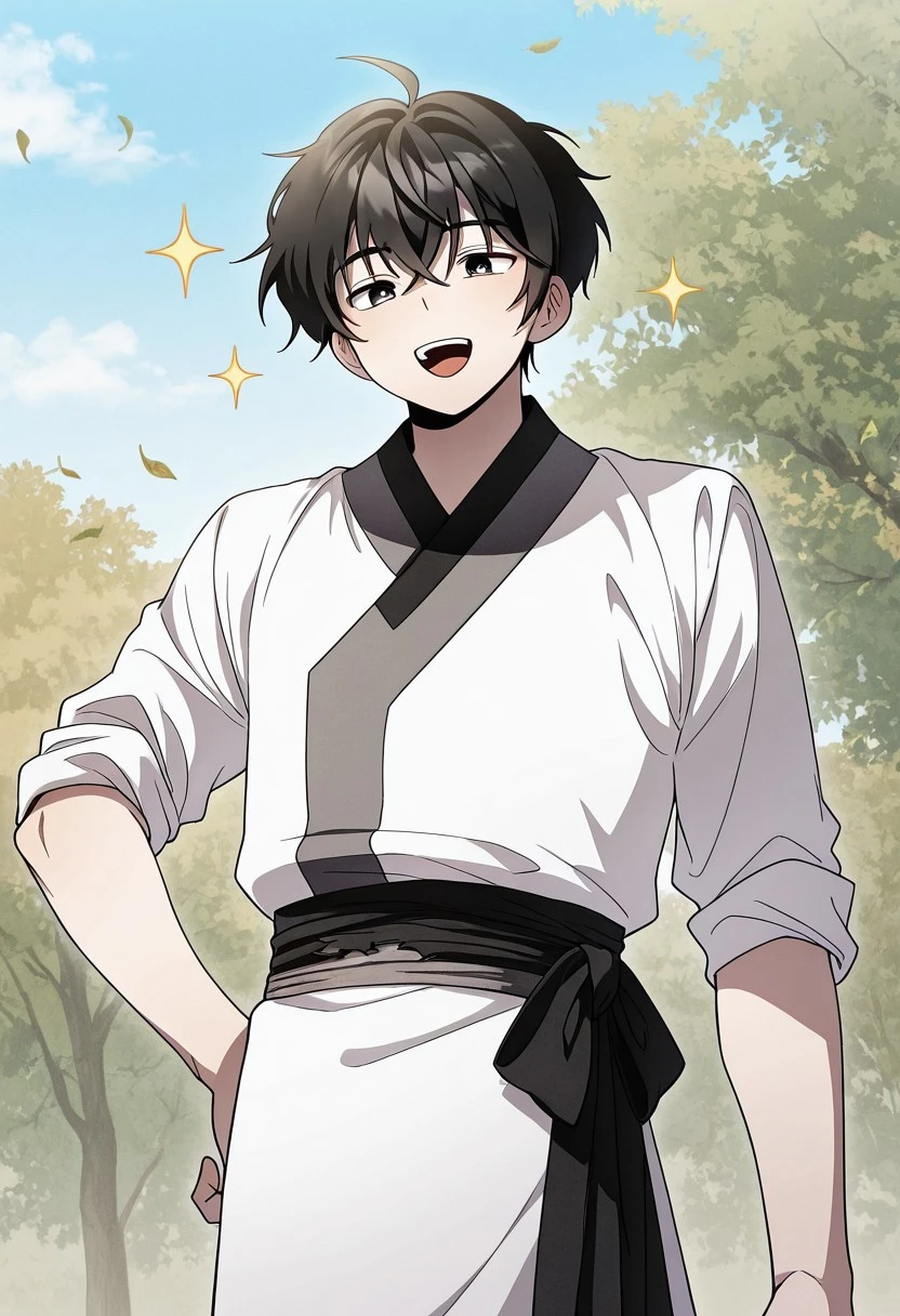 1boy, male focus, solo, black eyes, black hair, white dobok, waist sash, wrist guards, black pants, boots, black footwear,