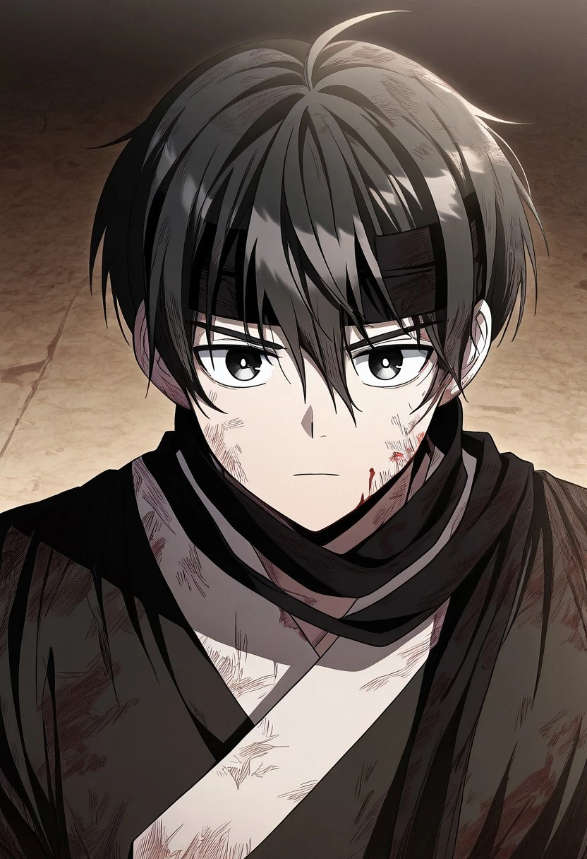 1boy, male focus, solo, black eyes, black hair, black headband, black scarf, black dobok, white pants,