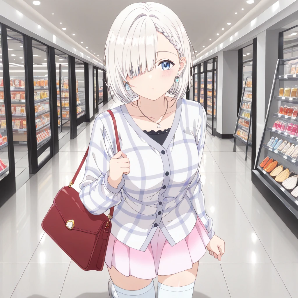 Casual Date: (MashiroCasualDate, clamshell earrings, clamshell necklace, black undershirt, white plaid shirt, long sleeves, shirt untucked, pink miniskirt, white thighhigh socks, zettai ryouiki, gray shoes, red purse)