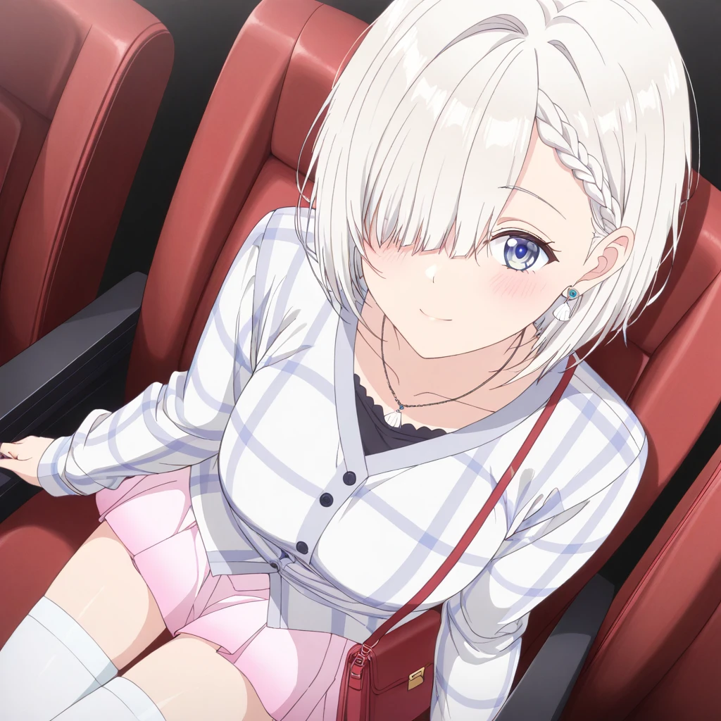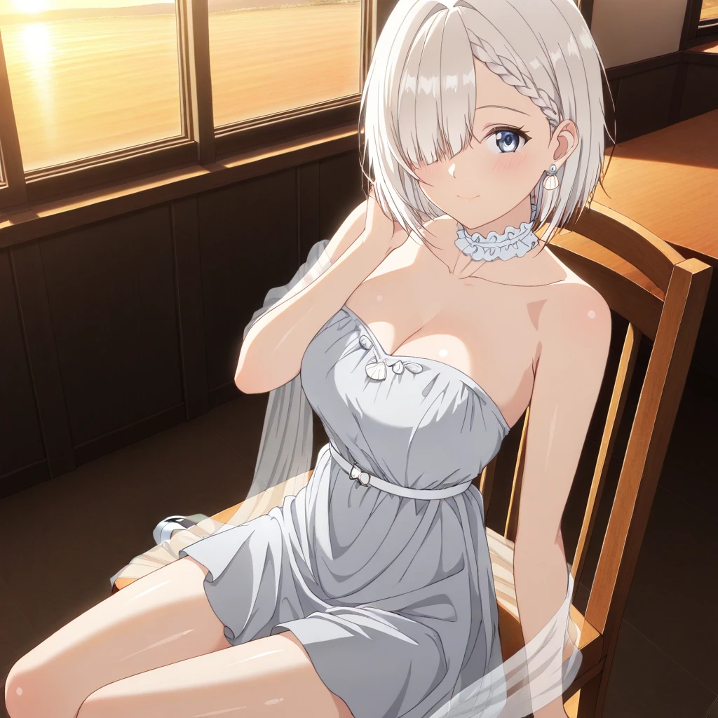 Trigger: (MashiroLittleSister, blue eyes, white hair, short hair, (hair covering one eye), braid, hair behind ear)