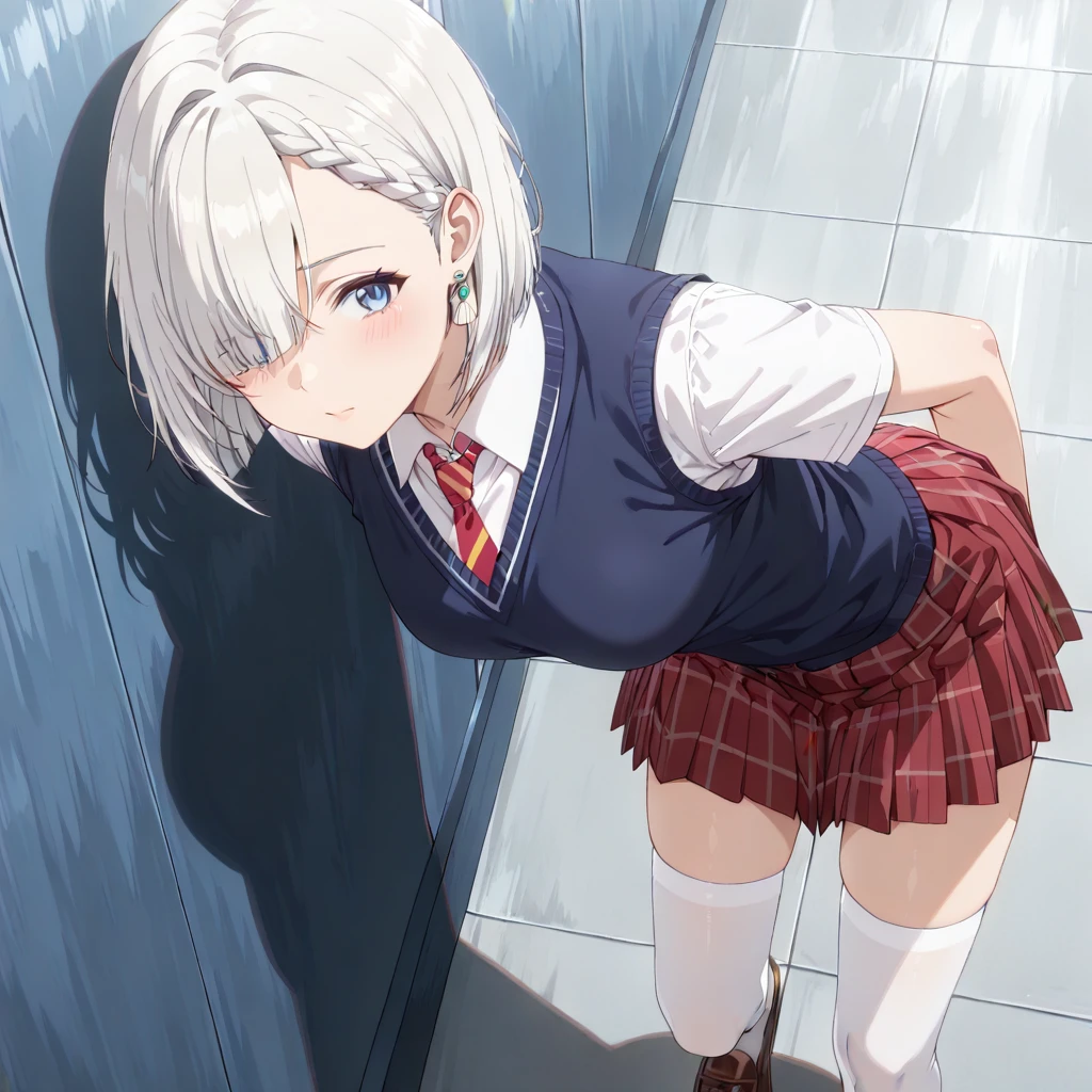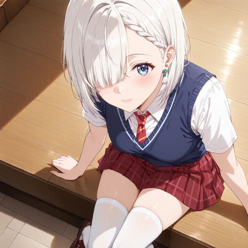 School Uniform: (MashiroSchool, clamshell earrings, white collared shirt, short sleeves, pleated skirt, , red tartan skirt, red necktie, blue sweater vest, white thighhigh socks, zettai ryouiki, brown loafers, school bag)