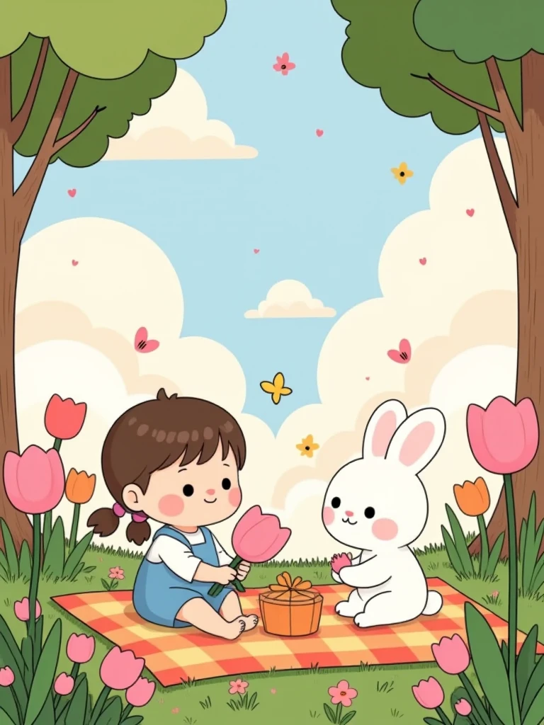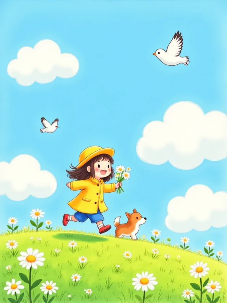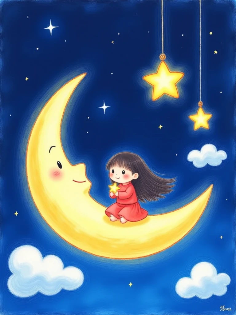 the image depicts a cute girl with long hair sitting on a smiling crescent moon, she is holding a star, surrounded by a starry night sky and fluffy clouds, two stars hang from strings above her