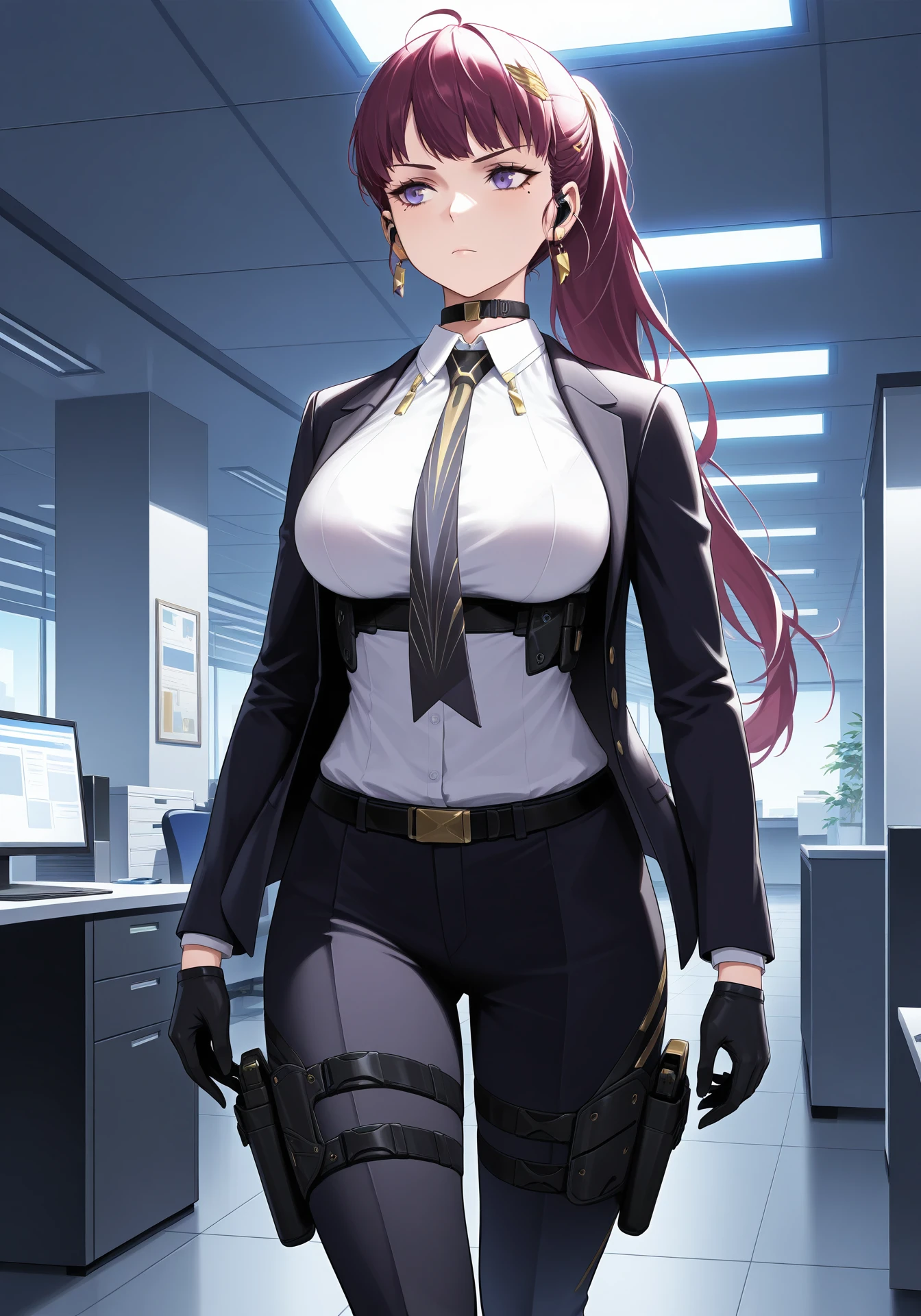 nikkedollasuit, black suit jacket, black pants suit,black mechanical boots,black gloves,golden jewelries on collar,dress shirt,golden earrings, black holster on thigh,black choker, buckle, golden purple black necktie,mole under eye,harness under breast