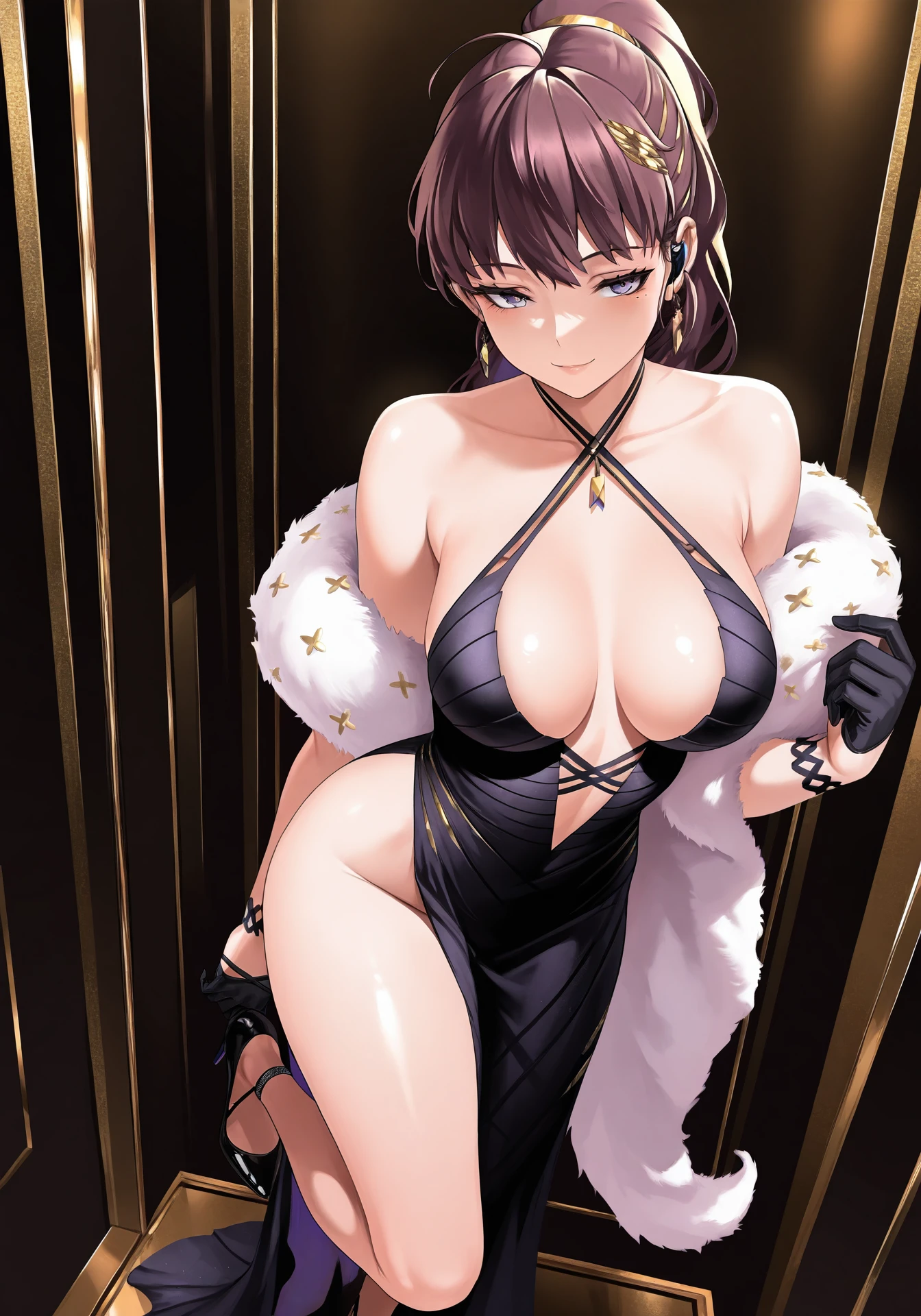 nikkedolladarkrose,bare shoulders,black backless cocktail dress,criss-cross halter,center opening,black half gloves,jewelry,feather boa,golden earrings, black high heels,golden hair ornament, mole under eye
