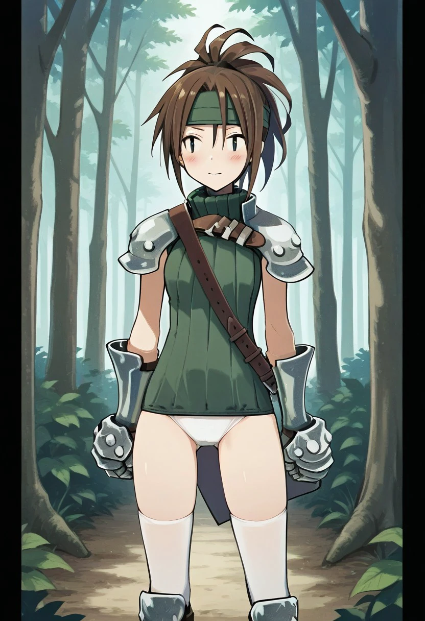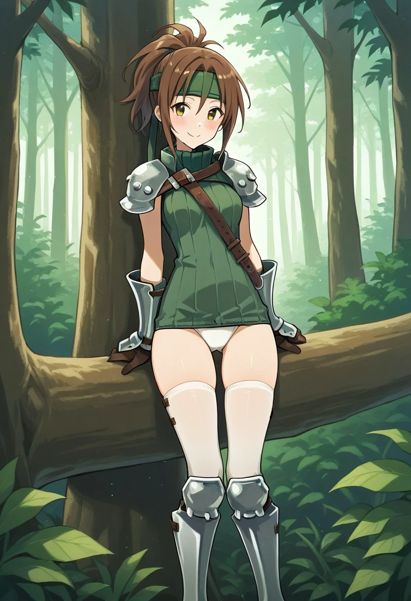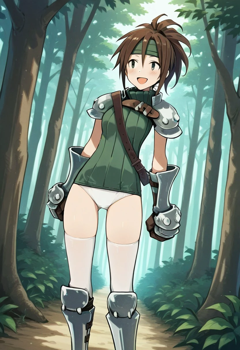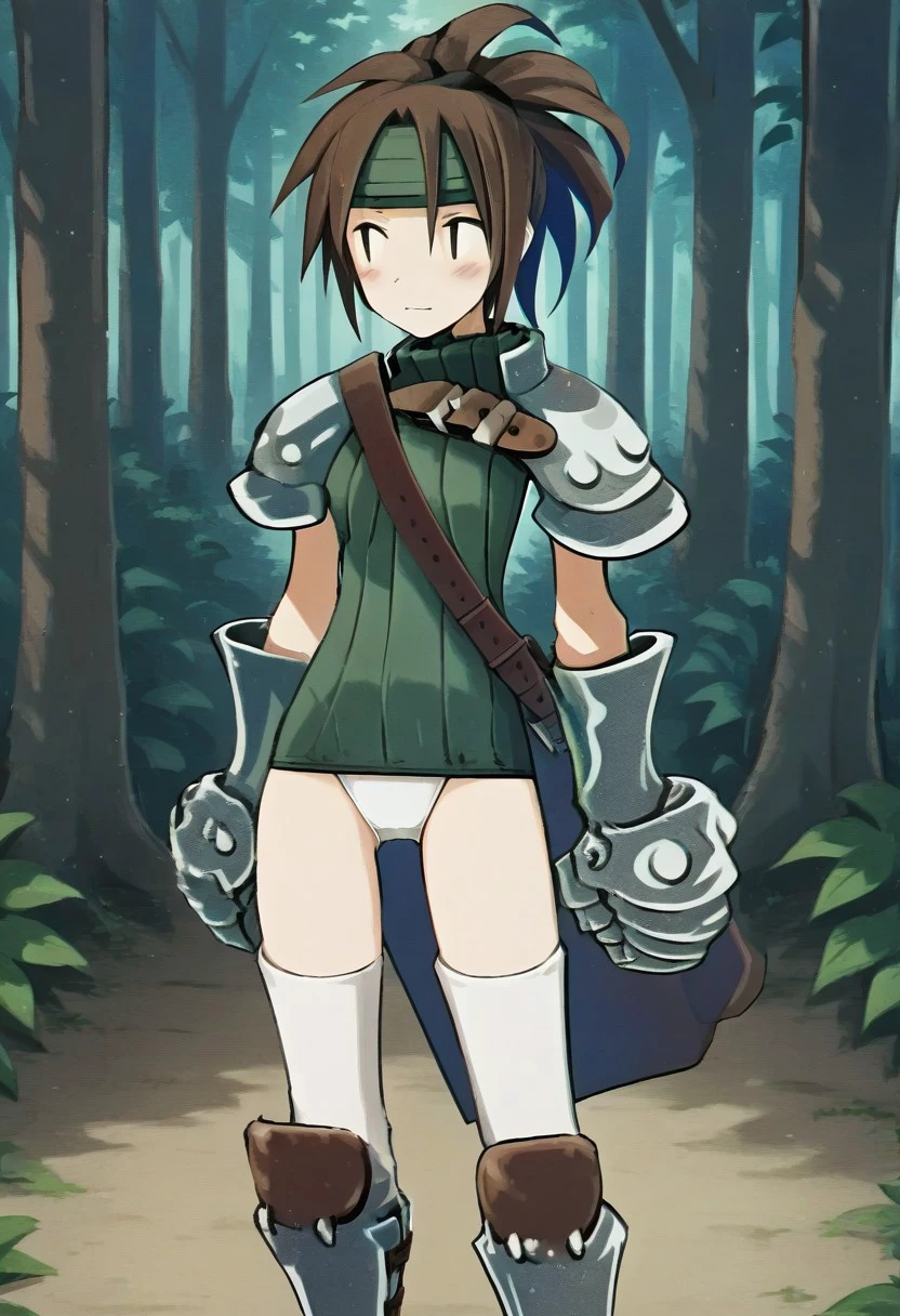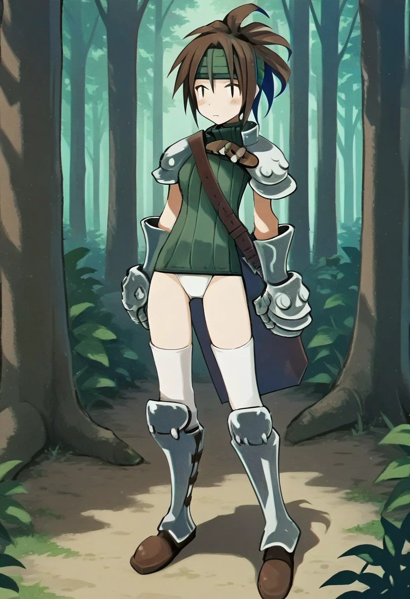Lady_knight,green outfit, sleeveless, ribbed fabric, brown hair, headband, armor, shoulder armor,leg armor,silver greeve,underwear,white thighhighs, panties, boots, ponytail, gloves,