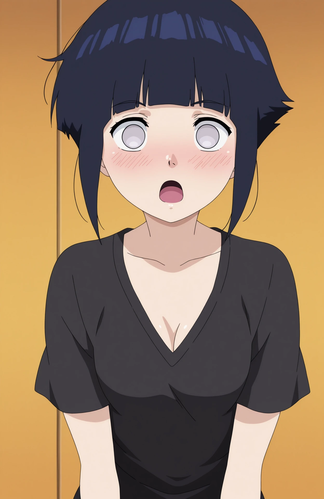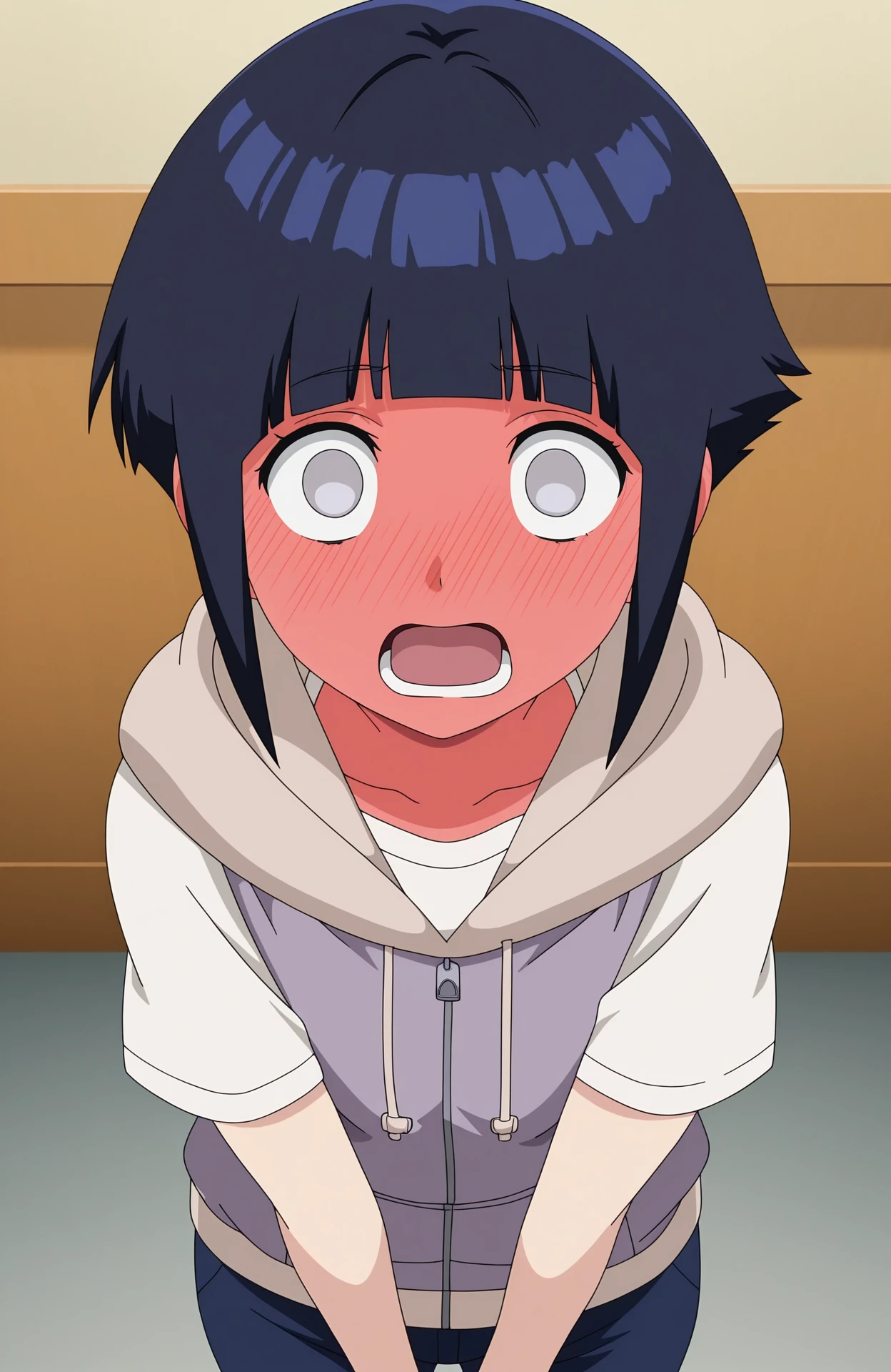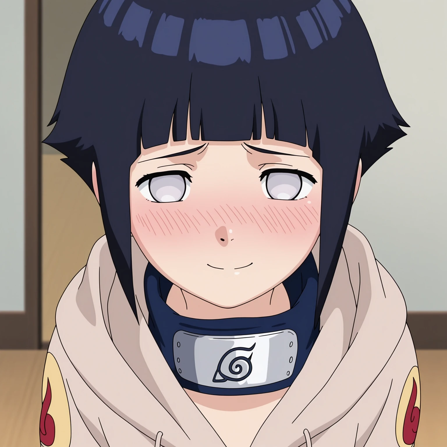 hinata genin, 1girl, short hair, short hair with long locks, blunt bangs, blue hair, grey eyes, no pupils,