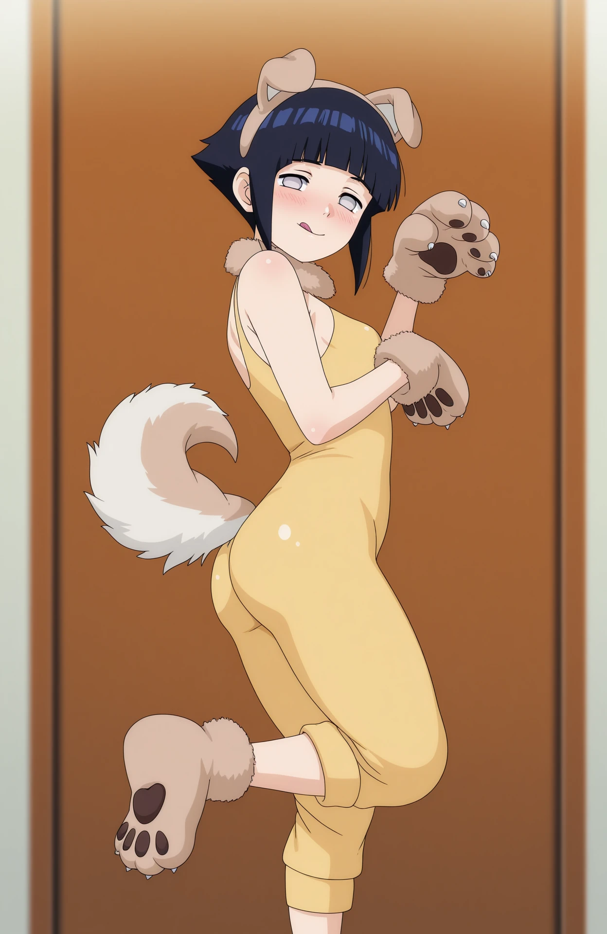 dog cosplay, paw gloves, paw shoes, dog ears, fake ears, fake tail, sleeveless bodysuit, yellow bodysuit