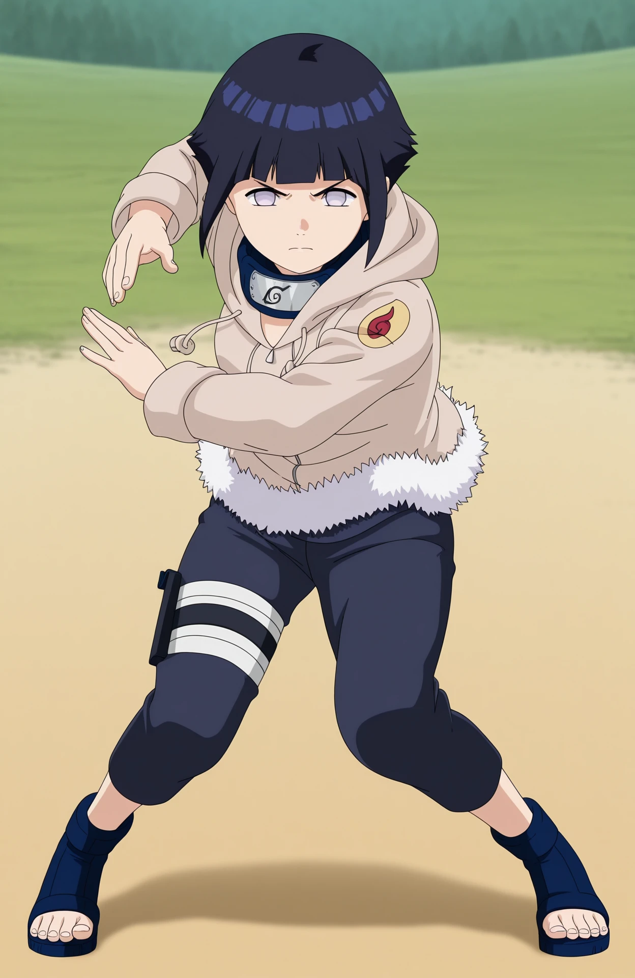forehead protector around neck, konohagakure symbol, hooded jacket, fur trim, blue pants, thigh holster, blue footwear, toeless footwear