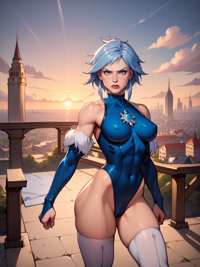 FrostLL, 1girl, blue hair, pale skin, highleg leotard, solo, pale skin, short hair, blue hair, highleg leotard, detached sleeves, bare shoulders, fur trim, fur boots, thighhighs, breasts, covered navel, blue eyes,