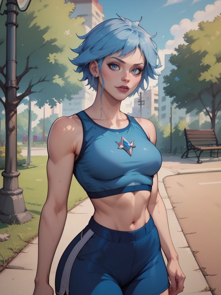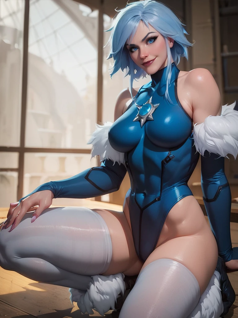 Prompt: FrostLL, 1girl, blue hair, pale skin, highleg leotard, solo, pale skin, short hair, blue hair, highleg leotard, detached sleeves, bare shoulders, fur trim, fur boots, thighhighs, breasts, covered navel, blue eyes,