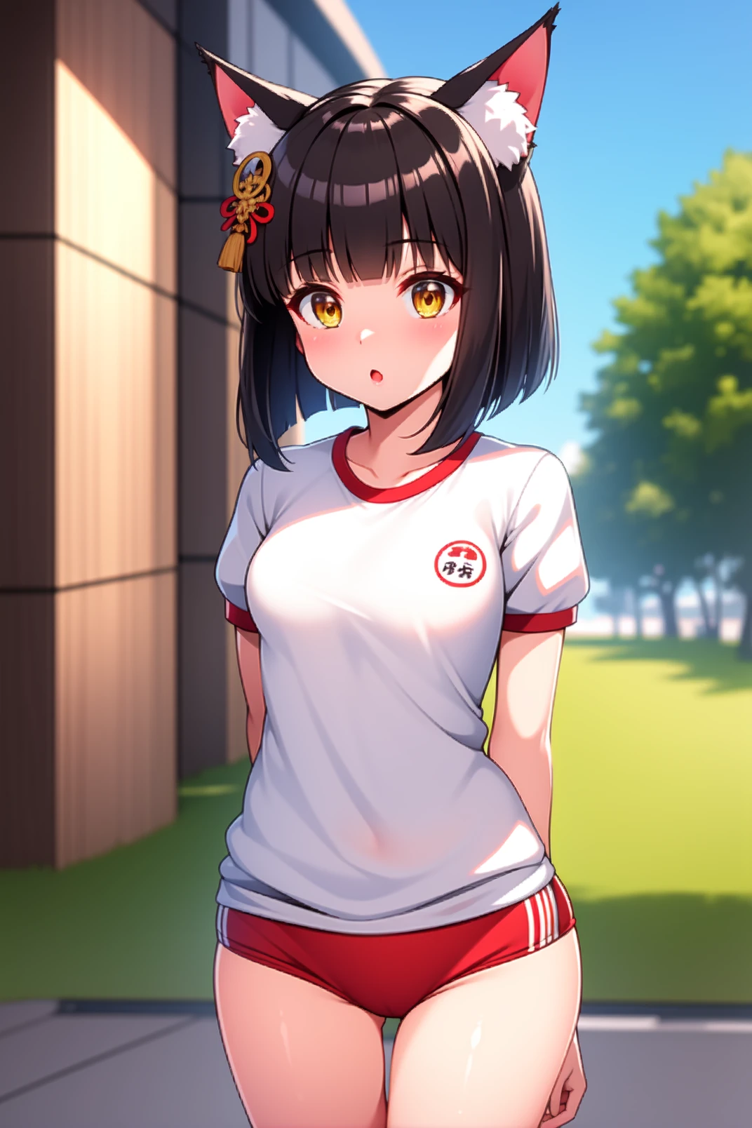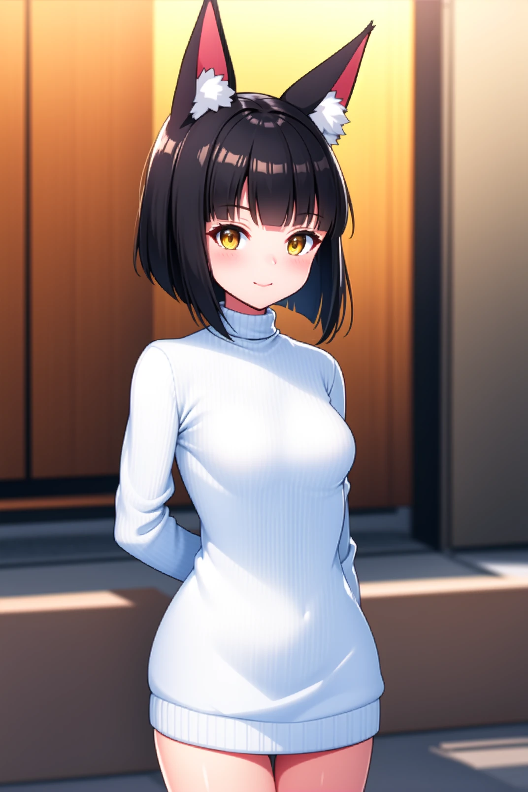 appearance: mutsu, yellow eyes, black hair, short hair, blunt bangs, fox ears, animal ear fluff