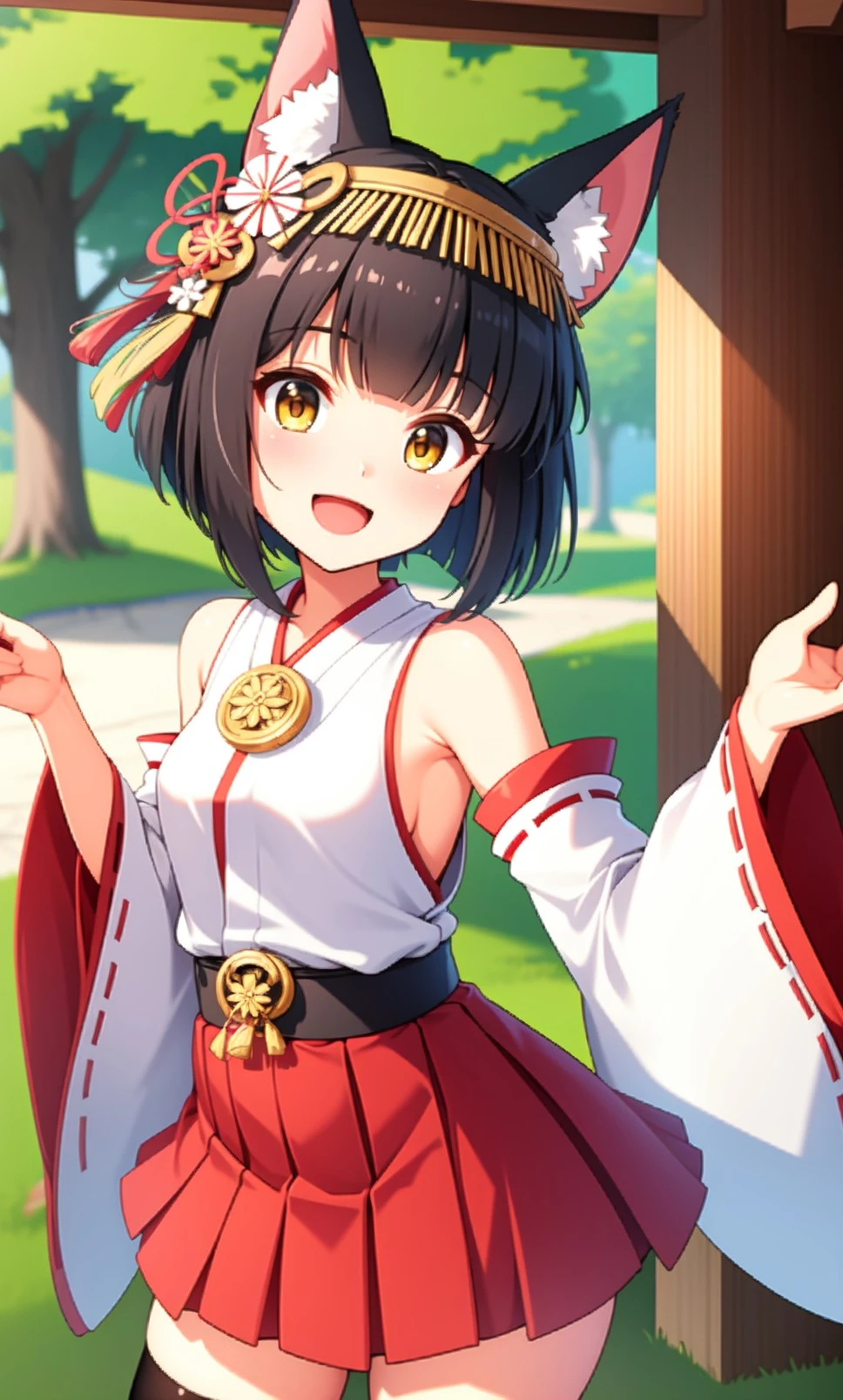 outfit: hair ornament, headpiece, japanese clothes, miko, detached sleeves, wide sleeves, ribbon-trimmed sleeves, red skirt, pleated skirt, black thighhighs
