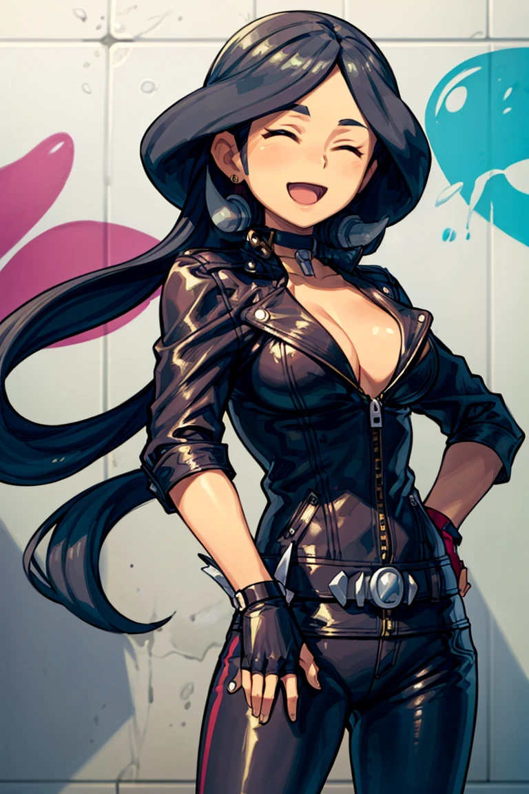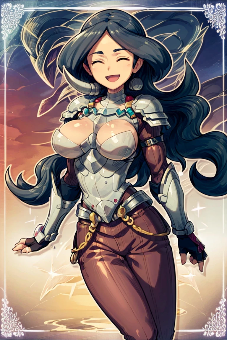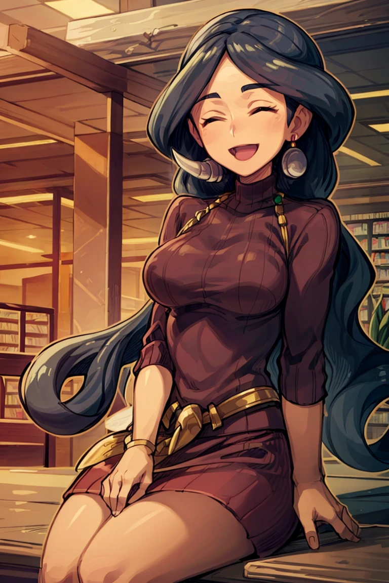 drasna (pokemon), 1girl, solo, long hair, black hair, closed eyes, earrings, jewelry, necklace, brown dress,