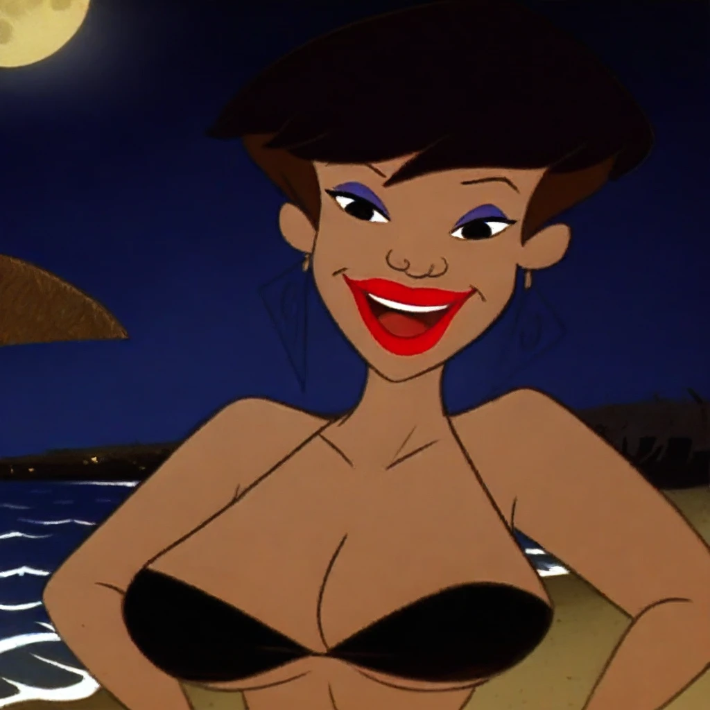 jami, red lipstick, black hair, sleeveless green top, earrings, dark red leggings, wide hips, makeup
