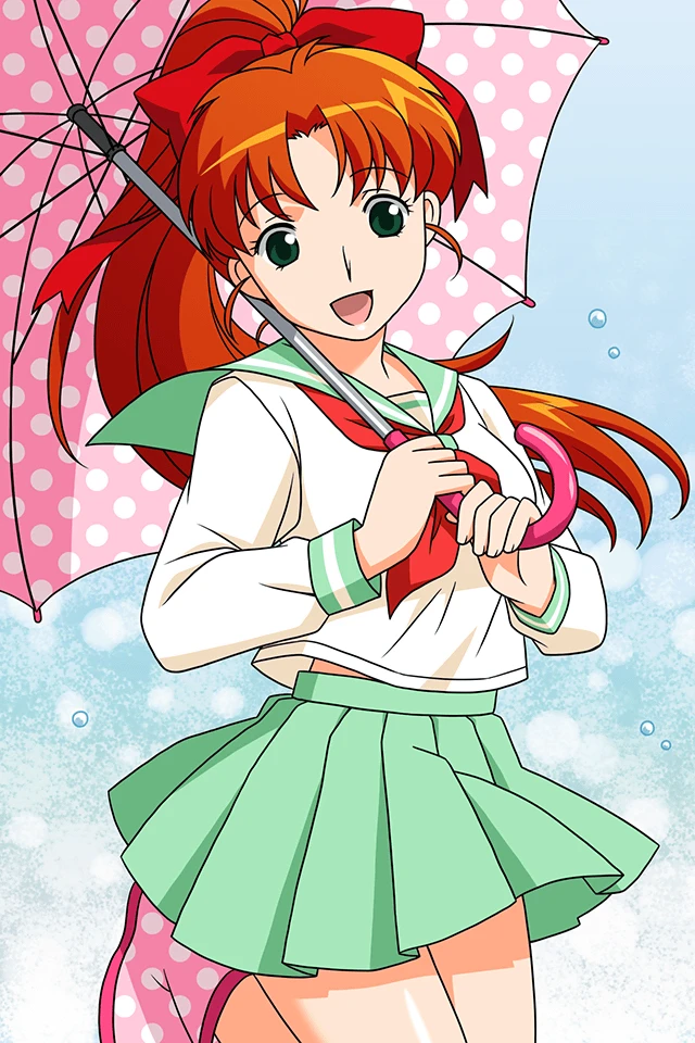 Trigger words: mana (super real mahjong), tanaka ryou, orange hair, long hair, high ponytail, red bow, hair bow, green eyes, medium breasts