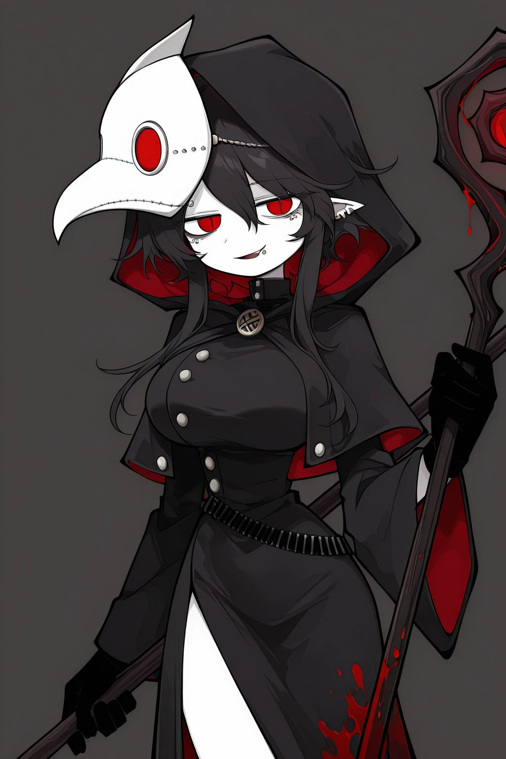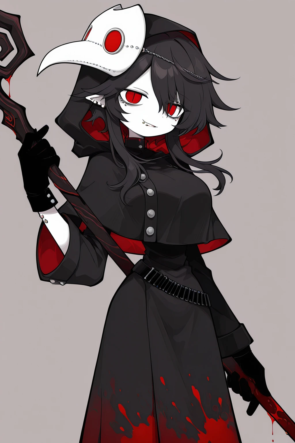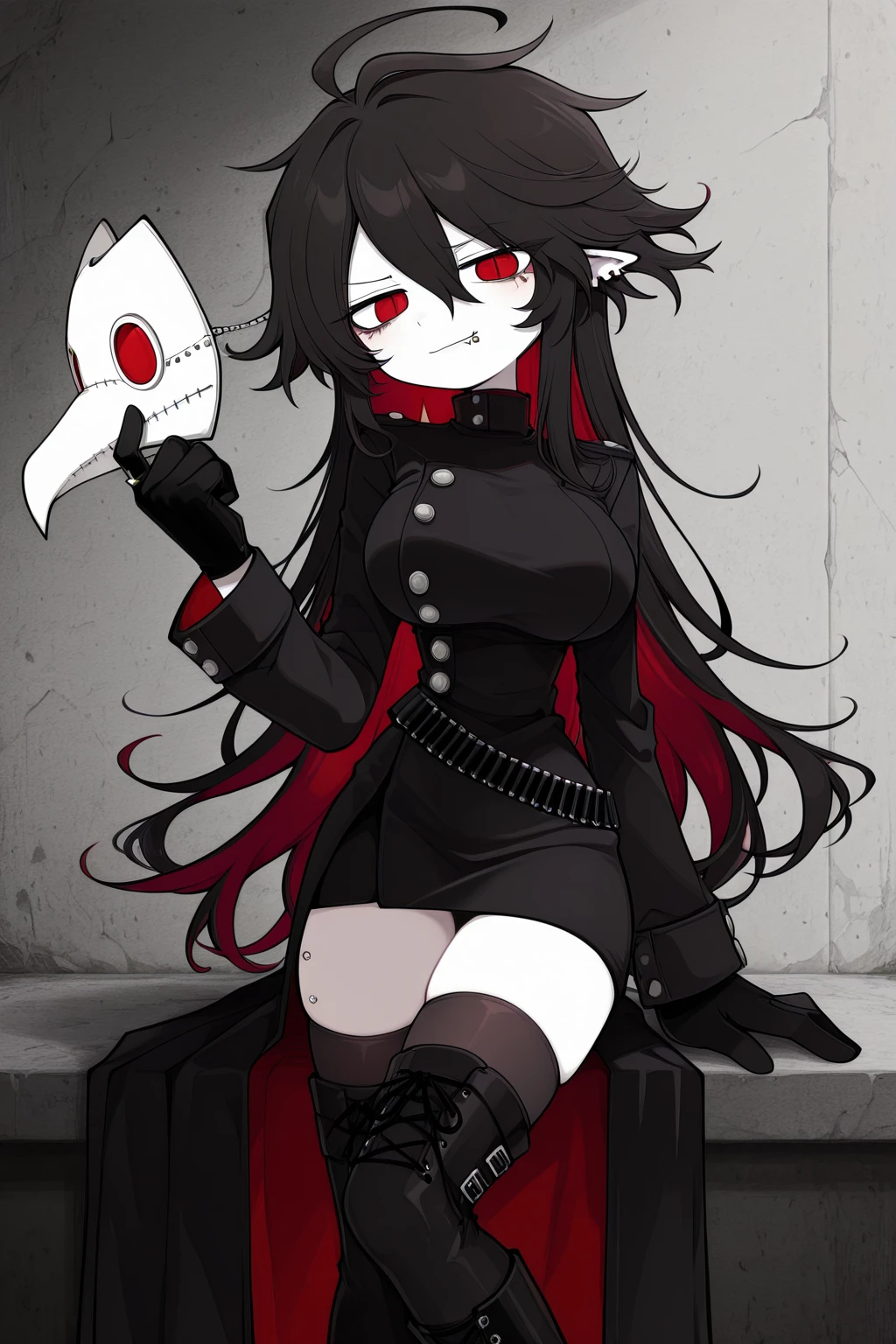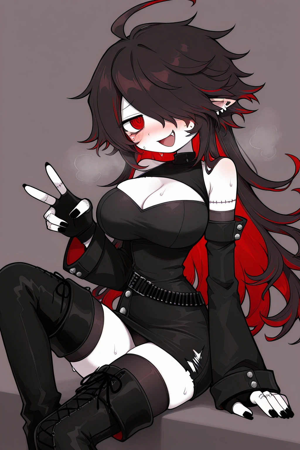 Dokugaiokeg,genderswap,1girl,large breasts,black hair,pointy ears,red eyes,pale skin,lip piercing,ear piercing,eyebrow piercing,piercing,