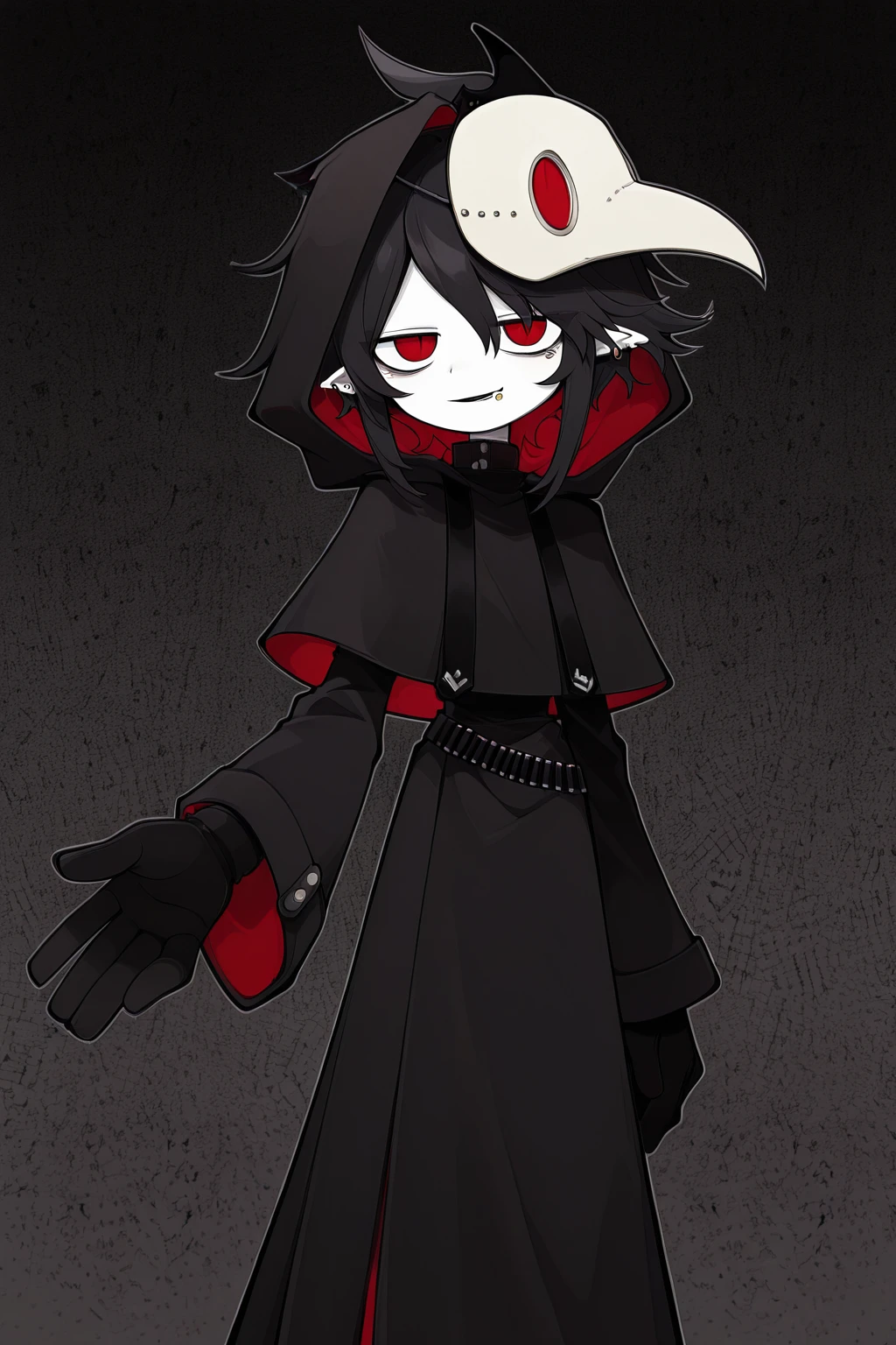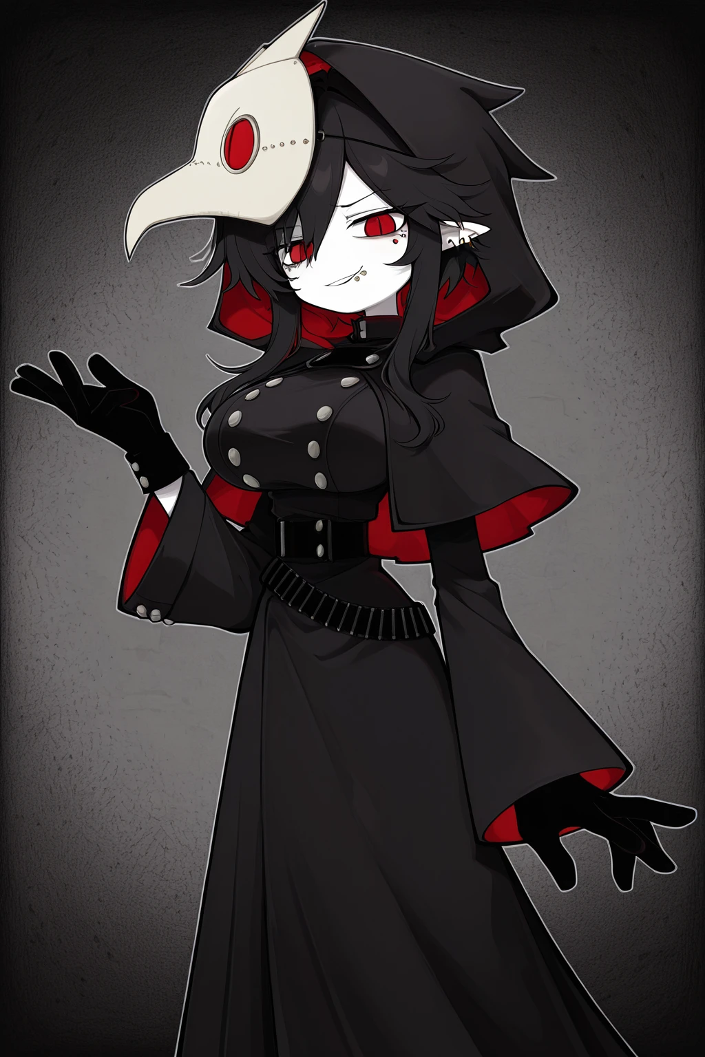 2. dokugaiuniform, black capelet,black gloves,black robe,capelet,gloves,hood,hood up,hooded capelet,robe,(mask on head:1.3),mask with beak,