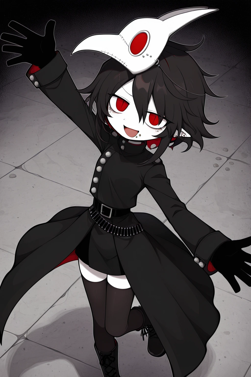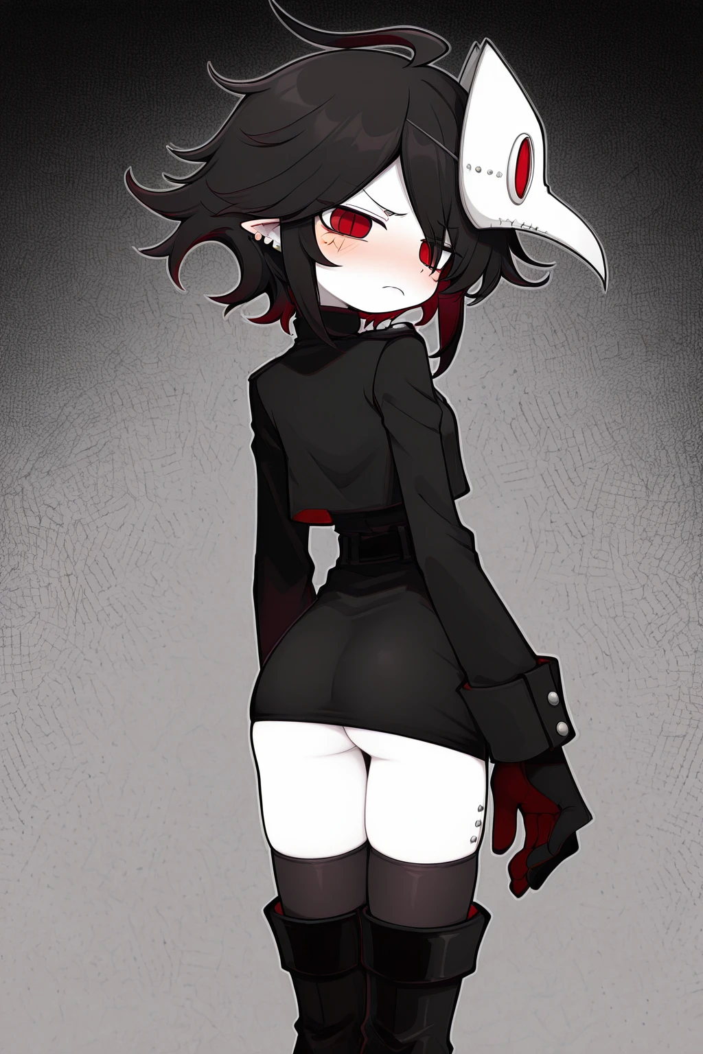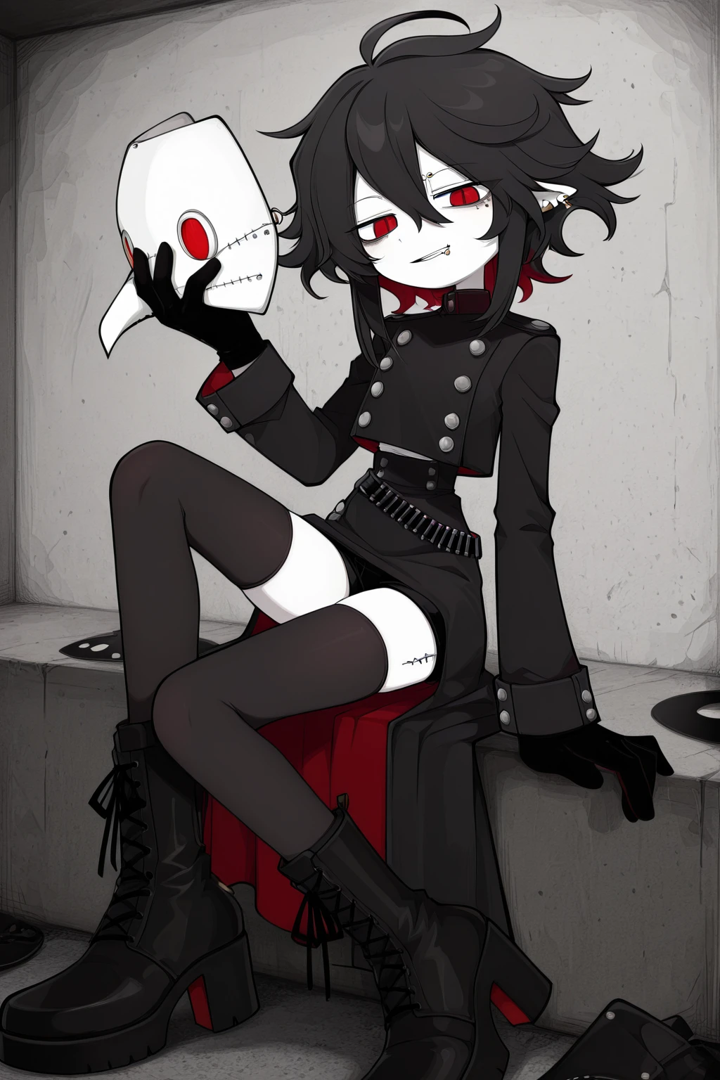 dokugaiuniform,black gloves,boots,gloves,mask,stitches,tattoo,thighhighs,