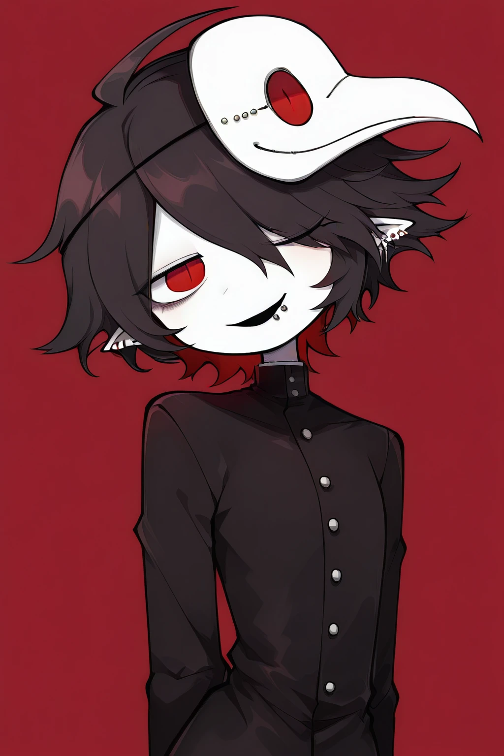 Dokugaiokeg,1boy,black hair,pointy ears,red eyes,pale skin,lip piercing,ear piercing,eyebrow piercing,piercing,
