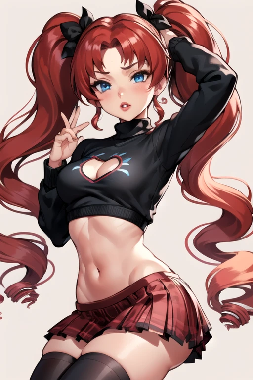 BiancaBella, 1girl, solo, very long hair, blue eyes, miniskirt, medium breasts, black thighhighs, navel, twintails, jewelry, red hair, midriff, black sweater, lips, crop top, clothing cutout, turtleneck, plaid skirt, drill hair, lipstick