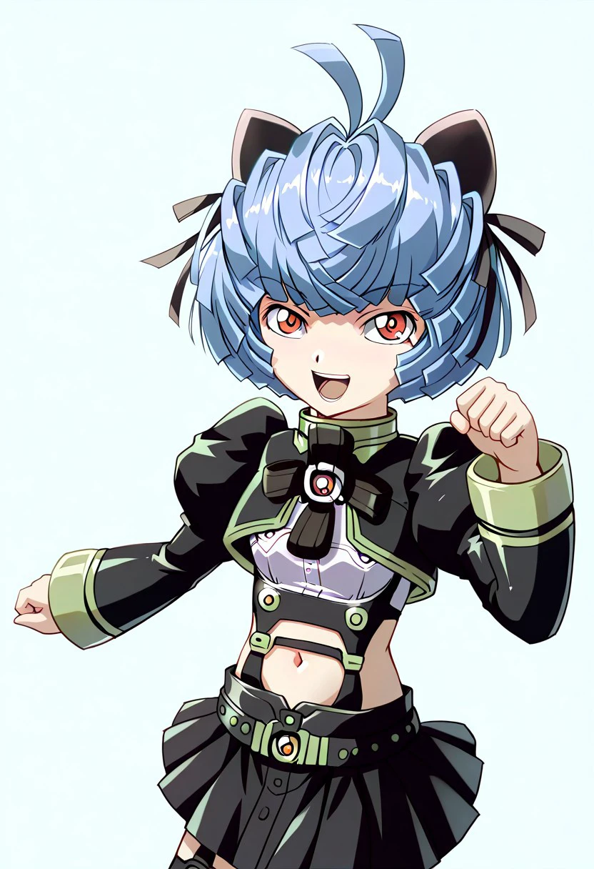 red eyes, skirt, short hair, navel, black skirt,cropped jacket, ahoge, ribbon, blue hair, pleated skirt, hair ribbon, animal ears, midriff, smile,Garter straps, Garter belt