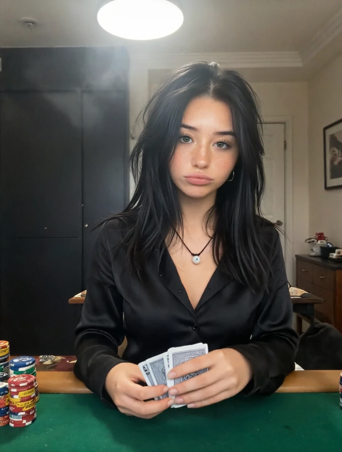 * Example: a woman with medium‑light skin and clear freckles, shoulder‑length straight black hair, hazel‑green eyes narrowed into a sharp, challenging glare, a cold, confident smirk on her lips, wearing a black silk button-down shirt with top buttons undone, revealing her black cord necklace with a small round white pendant, leaning forward over the table, holding a hand of cards